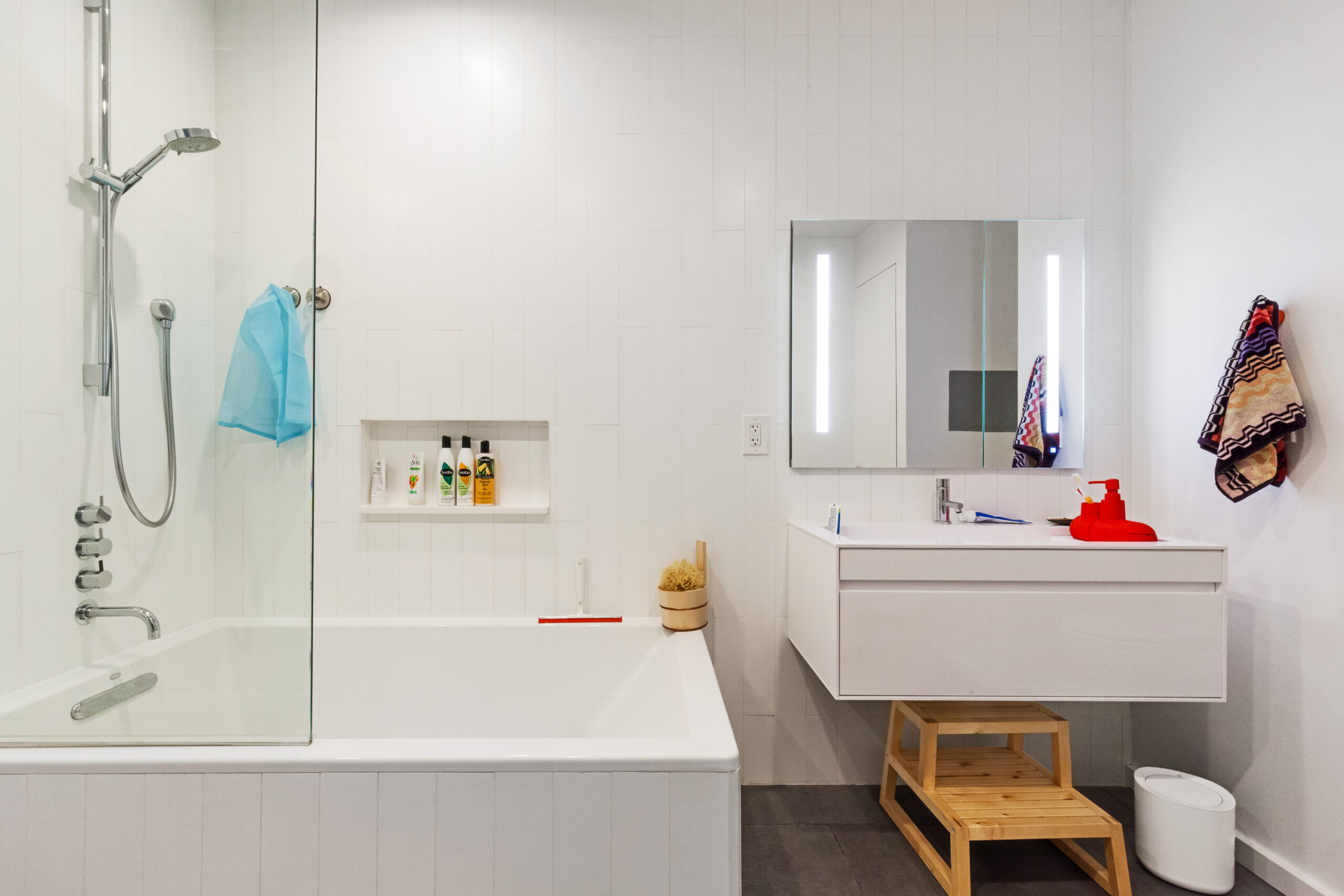 (Above) Rima’s remodeled bath with medicine cabinet, white subway tile, and black vanity
