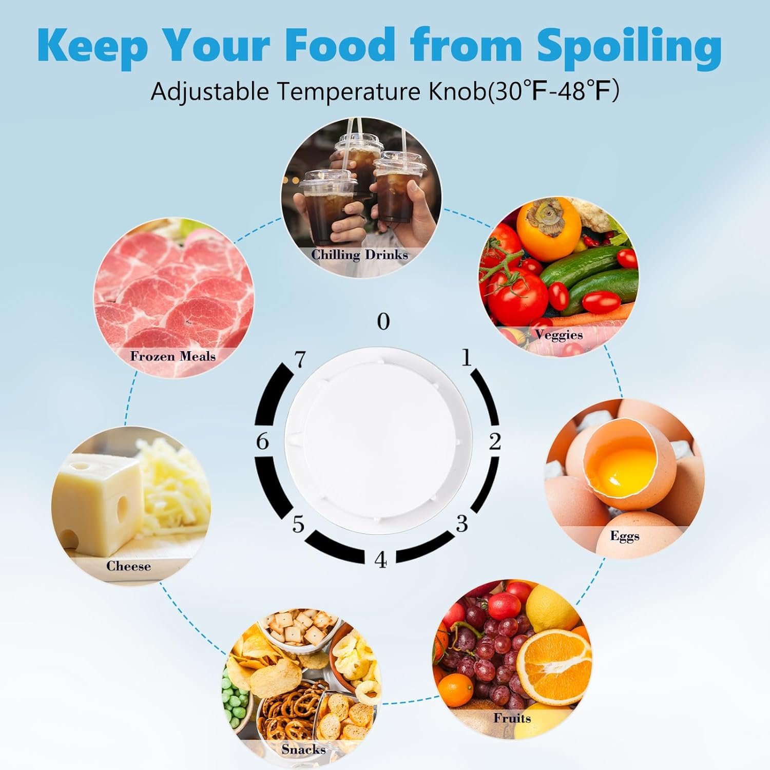 🥝𝐀𝐝𝐣𝐮𝐬𝐭𝐚𝐛𝐥𝐞 𝐓𝐞𝐦𝐩𝐞𝐫𝐚𝐭𝐮𝐫𝐞𝐬: This Mini Fridge has a rotary thermostat button inside. The freezer has a temperature range of 32°F to 50°F (not suitable for storing ice cream) and the fridge offers 7 variable temperature settings depending on your needs. Cold storage and larger freezer compartment for storing beverages, fruits, face masks or a small amount of frozen food.