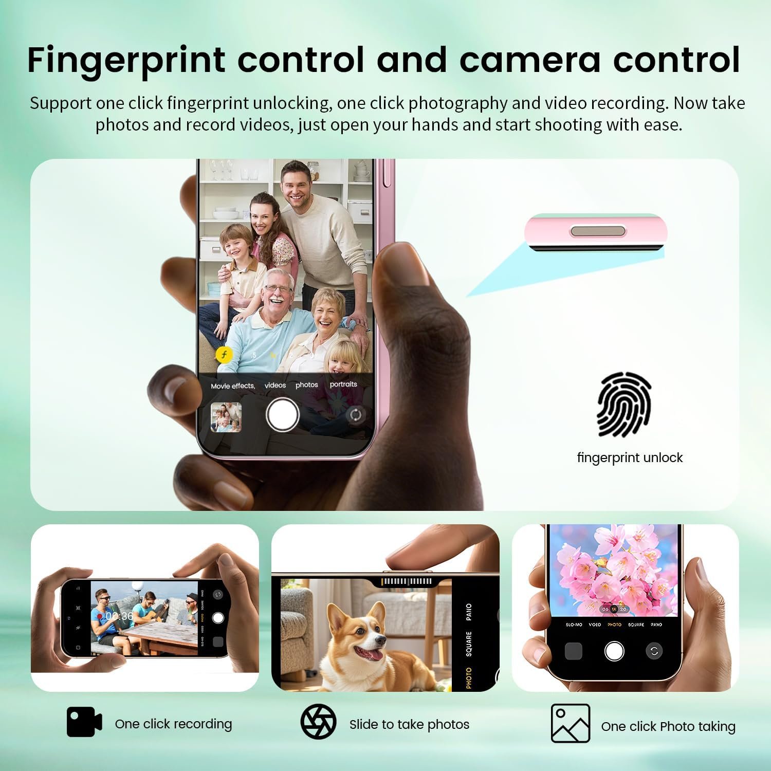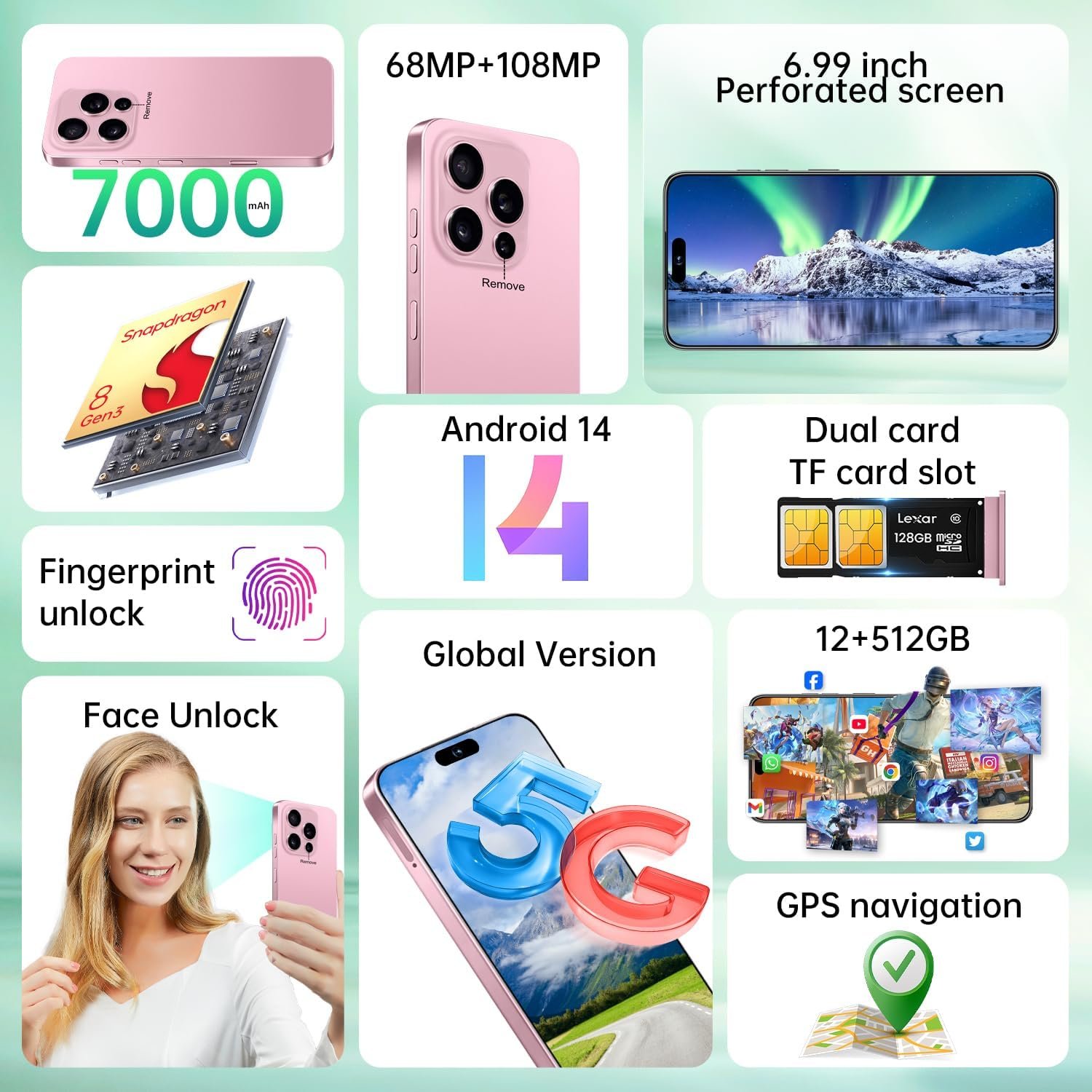 【6.99“ HD AMOLED Screen】6.99-inch HD AMOLED Screen with 1440*3040 resolution 5G cell phones, deliver more vibrant colors and stronger contrasts. The use of high-grade titanium material gives it lighter. Facial recognition, Fingerprint button unlock and Quick button for taking photos, Better protection of your privacy.