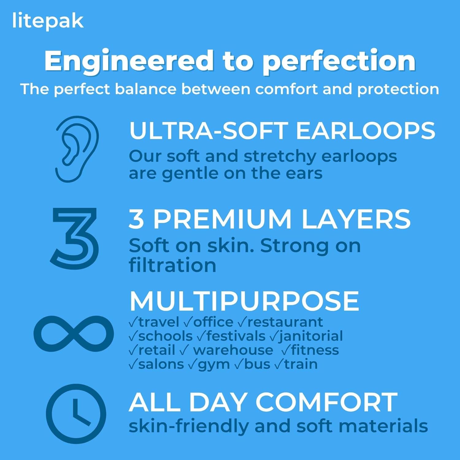 We’ve designed our mask to have the perfect balance between breathability and comfort. From the soft earloops and skin-friendly layer, to the moldable nose wire and inner filter, we obsessed over every detail of our Litepak Mask.