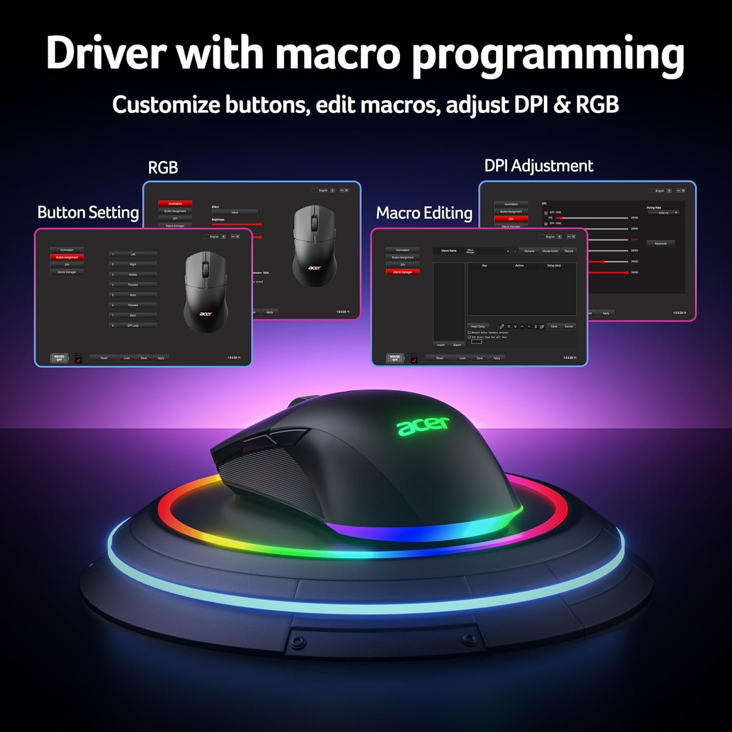 acer Wireless Gaming Mouse for Laptop, 24,000 DPI Wired Computer Mouse with 8 Programmable Buttons, Left & Right Hand, Rechargable Gaming Mice, Long Battery Life, RGB Lighting Gamer for PC, Desktop