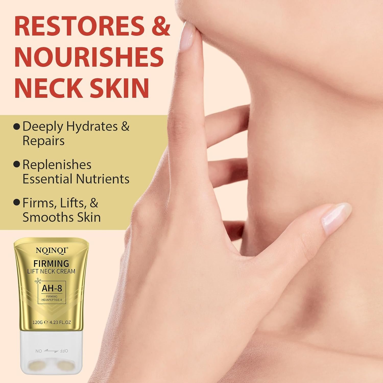 【Firm, Lift & Tighten】 This neck cream contains Acetyl Hexapeptide-8 (AH-8), Ceramide and Allantoin. It visibly tightens loose skin, restores elasticity and creates a firm, youthful swan neck.