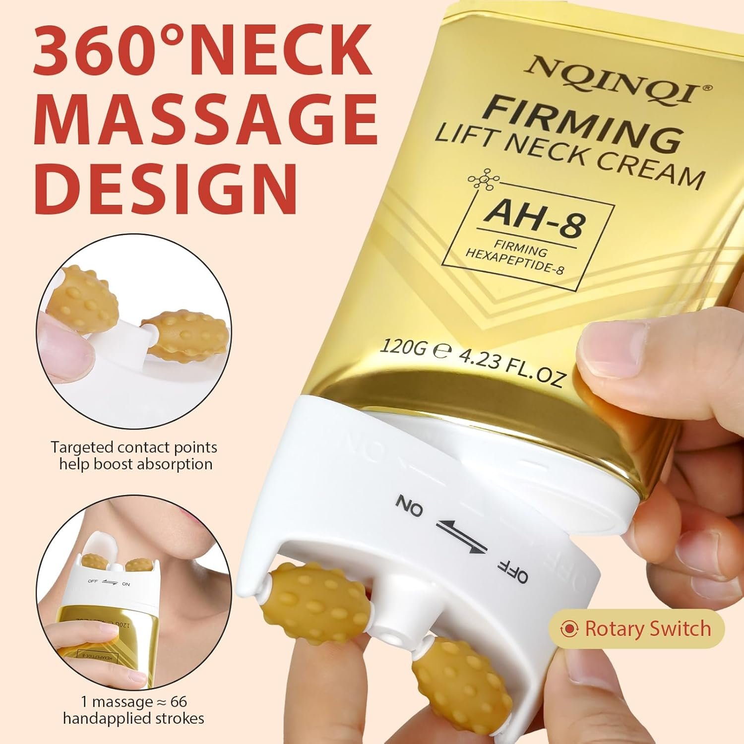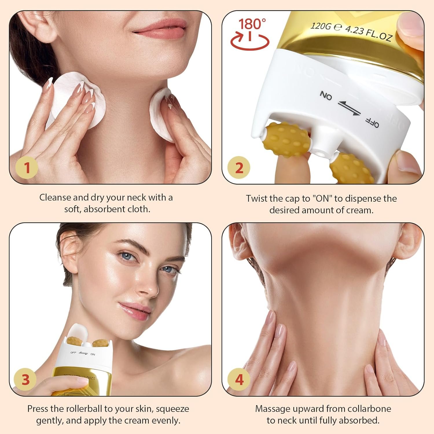【Smooth Dryness & Rough Texture】 The Roller Neck Firming Tightening Cream features a cooling applicator to gently massage away rough patches, promoting silky-smooth texture and even tone.
