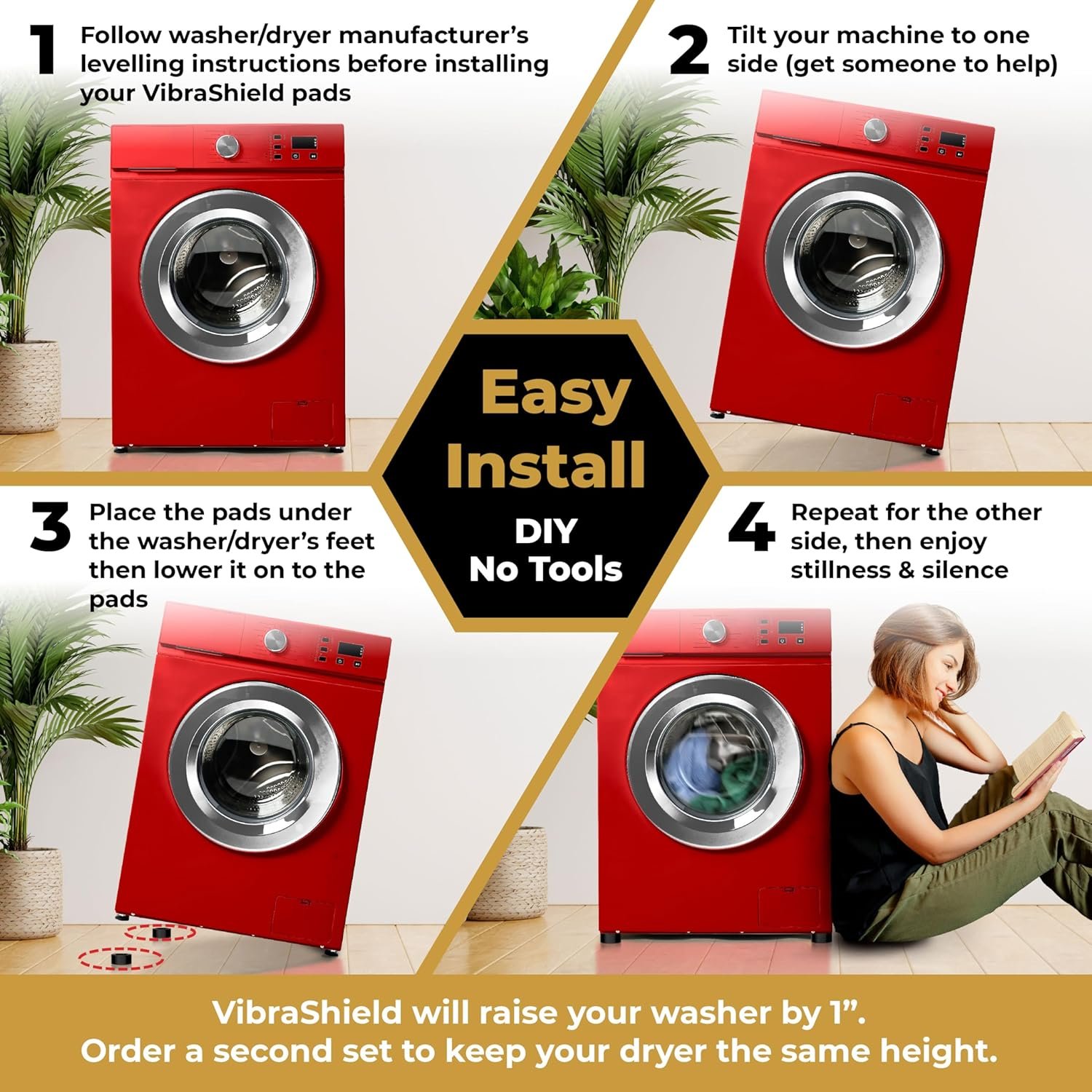 Stops Walking & Skidding by Anchoring Appliances – Our Dual HexaGrip anchors your vibrating appliance, preventing it from moving around. This unique design puts up to 60% more pad surface area in direct contact with your floor, providing superior tractionRestores Quiet by Minimizing Vibration & Noise from Washing Machines & Other Appliances – Our durable, heavy-duty material, engineered for outstanding sound and vibration isolation, dampens vibrations and noise transferred from appliances to your floor and the rest of your homeProtects Floors & Appliances – Absorbs impacts from vibrating appliances to protect floors and the appliance itself from damage.Universal Fit – Compatible with front or top load washer, dryer, 2-in-1, or other appliance from any brand. Works with any side by side, stacked, or standalone appliance with or without pedestals, with feet up to 2.5″ in diameterQuick & Easy DIY Install in Minutes Without Tools – Simply tilt your appliance to one side, slide a VibraShield pad under each lifted foot, lower your appliance’s feet onto the pads, then repeat for the other side. Installs quickly in a few easy steps without tools or professional installation. Before installing, ensure your appliance is levelNon-stink Material – Our material does not emit the strong lingering odors that buyers of other similar pads complain aboutREMINDER: Order 2 sets of VibraShield pads for your side by side washer and dryer to keep them both the same height