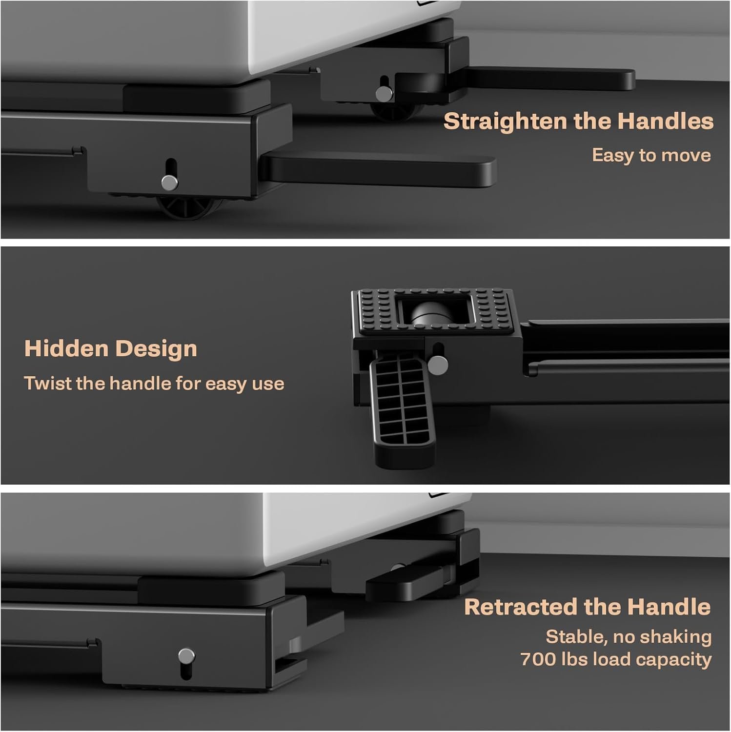 Strong Construction: This heavy duty appliance rollers is made of carbon steel as a whole, which has a frosted texture to the touch and upgraded anti-slip pads on the bottom, which has a larger contact surface compared to other washing machine stand, fits the floor tightly, protects the floor from wear and tear, and has a maximum load capacity of 700 lbs