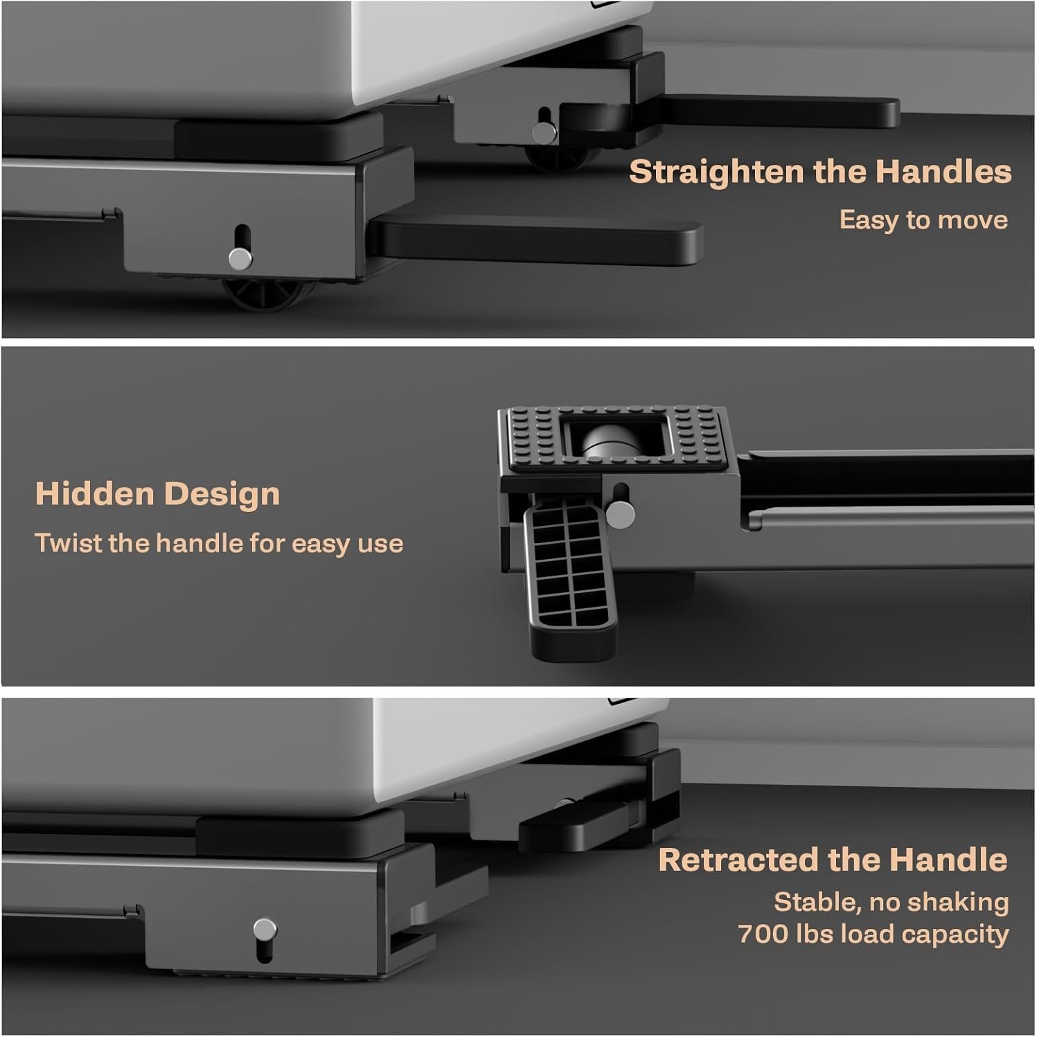 Strong Construction: This heavy duty appliance rollers is made of carbon steel as a whole, which has a frosted texture to the touch and upgraded anti-slip pads on the bottom, which has a larger contact surface compared to other washing machine stand, fits the floor tightly, protects the floor from wear and tear, and has a maximum load capacity of 700 lbs