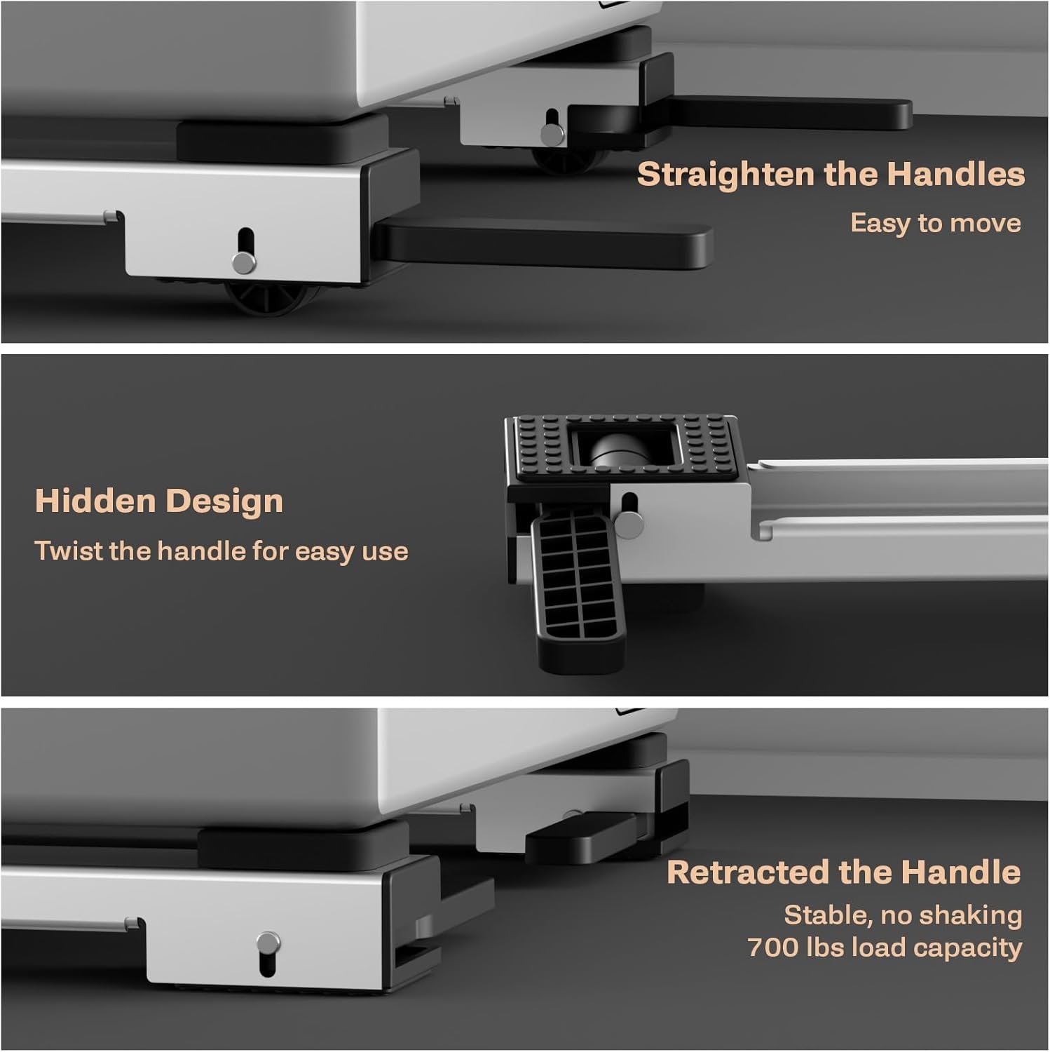 Strong Construction: This heavy duty appliance rollers is made of carbon steel as a whole, which has a frosted texture to the touch and upgraded anti-slip pads on the bottom, which has a larger contact surface compared to other washing machine stand, fits the floor tightly, protects the floor from wear and tear, and has a maximum load capacity of 700 lbs