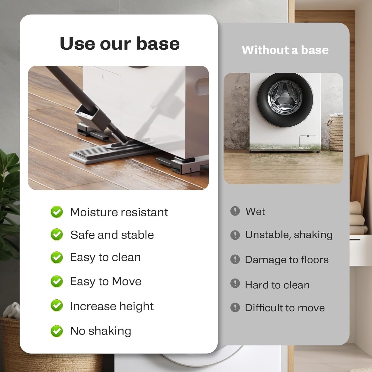 Increased Height & Moisture Resistance: Use our appliance moving slider with non-slip pads underneath and fixed square molds on top, easily increase the height by 1.96inch (Embedded washing machine requires reserved space), keep appliances away from the floor, keep the bottom ventilated to prevent water and rust from accumulating and prolong the appliance’s lifespan. Perfect for home washer, dryer, refrigerator and other large furniture and appliances movers
