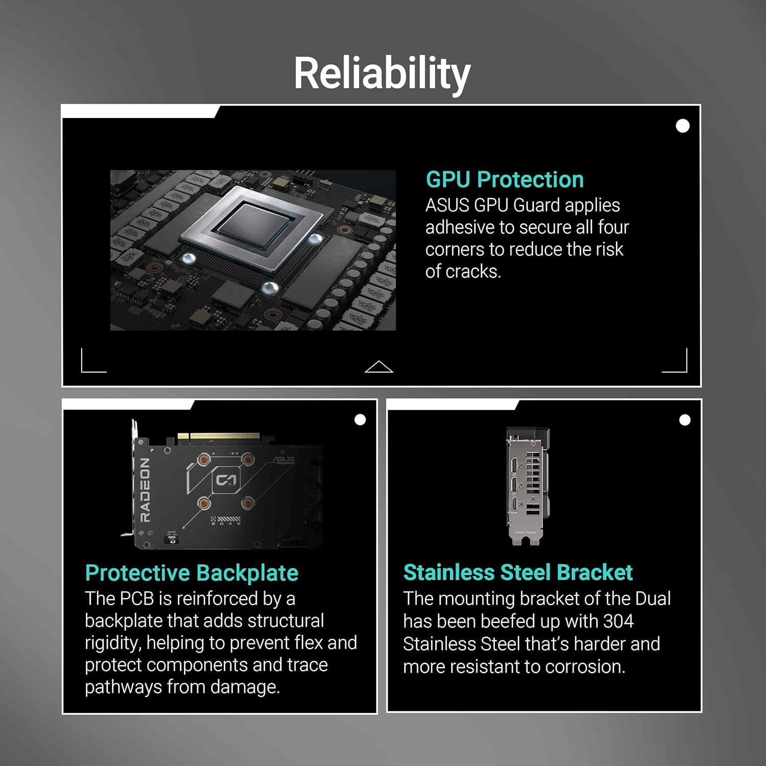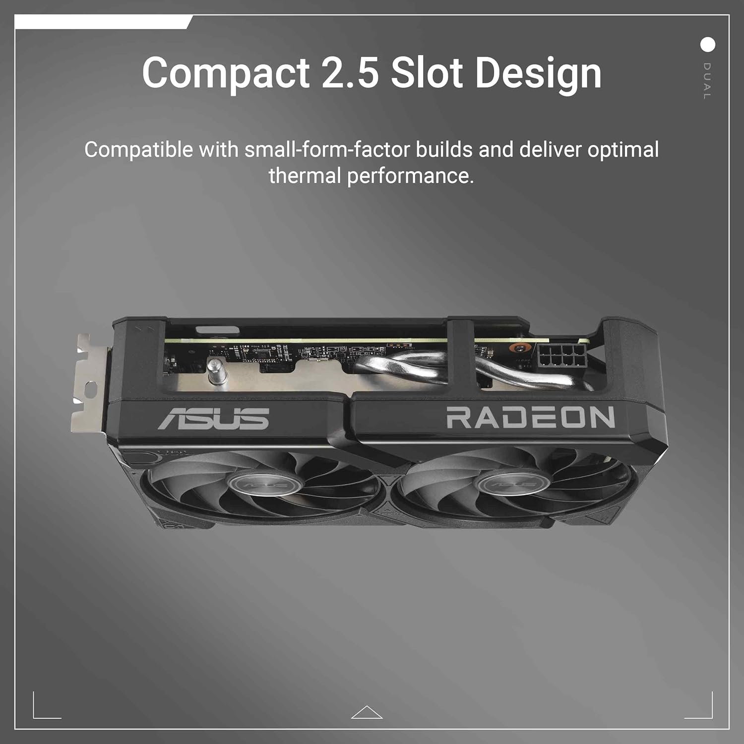 ASUS Dual Radeon™ RX 9060 XT combines powerful thermal performance with broad compatibility. Advanced cooling solutions from flagship graphics cards — including two Axial-tech fans for optimizing airflow to the heatsink. Designed in a compact 2.5-slot form factor, delivering more power in less space. These enhancements make ASUS Dual the perfect choice for gamers who want heavyweight graphics performance in a compact build.