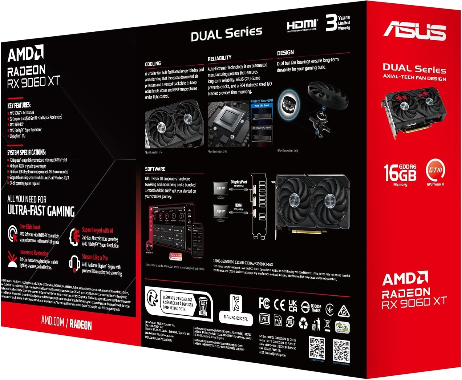ASUS Dual Radeon™ RX 9060 XT 16GB GDDR6 Graphics Card (PCIe 5.0, HDMI 2.1b, DisplayPort 2.1a, 2.5-Slot Design, Axial-tech Fan Design, 0dB Technology, and More)