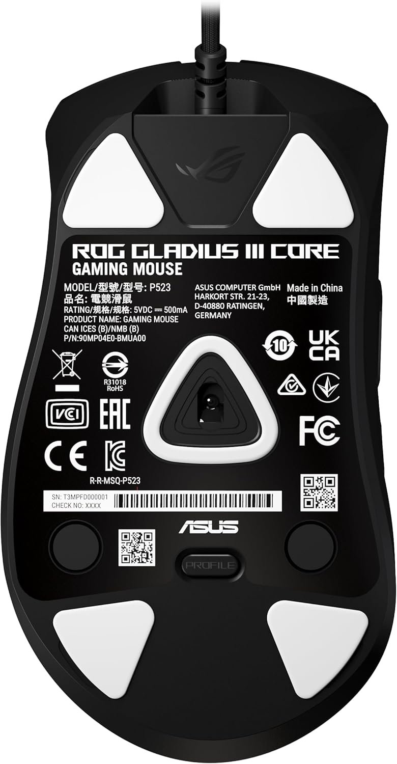 ASUS ROG Gladius III Core Wired Gaming Mouse – Right-Handed Ergonomic, 72g, 12K DPI, ROG Paracord, Push-Fit Switch Sockets/Hot-Swappable Switches, Gear Link Web-Based Configuration, PC/Mac Support