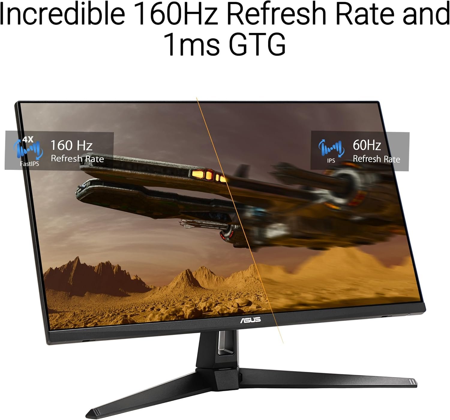The 27-inch TUF Gaming VG27UQ1A 4K UHD gaming monitor featuring a Fast IPS panel and NVIDIA® G-SYNC® Compatible for blistering-fast 160 Hz gaming. Its clever combination of Display Stream Compression (DSC), ASUS Extreme Low Motion Blur Sync (ELMB Sync) and AMD FreeSync™ Premium technologies enables buttery-smooth gaming on PCs. Console gamers can get their fix, too, as Supports up to 4K 120 Hz visuals via HDMI® 2.1 without chroma subsampling. In addition, it has a 95% DCI-P3 gamut to offer exceptional colors and contrast.