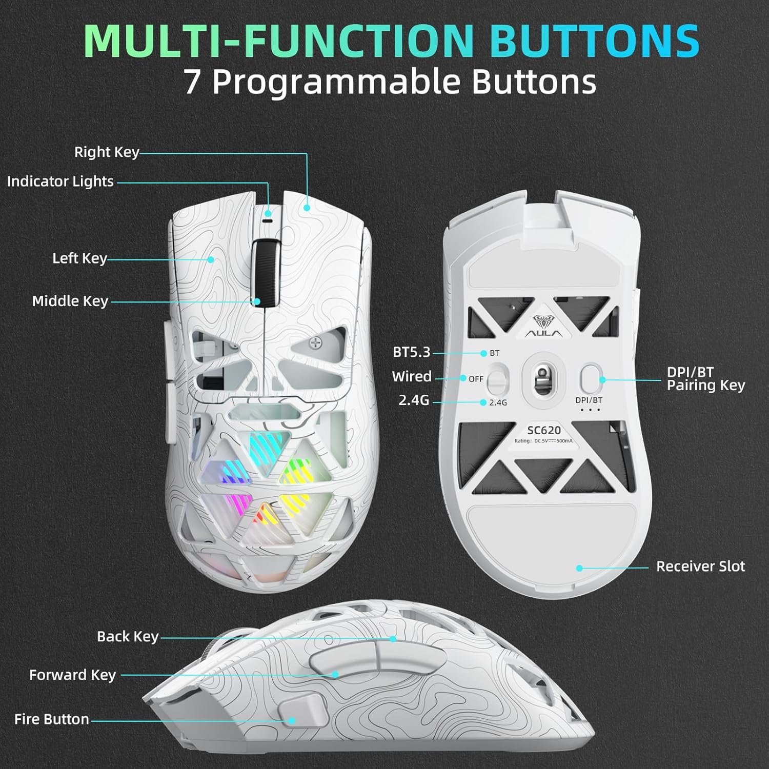 Macro Programming & Fire Button: This Aula gaming mouse wireless features 7 programmable buttons, supporting remapping, macro recording, DPI adjustment, polling rate, sleep time, and lighting mode settings via the AULA driver (soaidriver.com). Dedicated Fire Button for One-Click Critical Commands: Map game burst fire, MMO skill combos, or office app shortcuts—eliminating repetitive clicks and complex keybinds. Whether eliminating enemies or optimizing workflows, it transforms complex actions into single-click execution, elevating your wireless mouse gaming experience. Note: Supports Windows systems in 2.4GHz wireless and wired modes; BT mode is unavailable