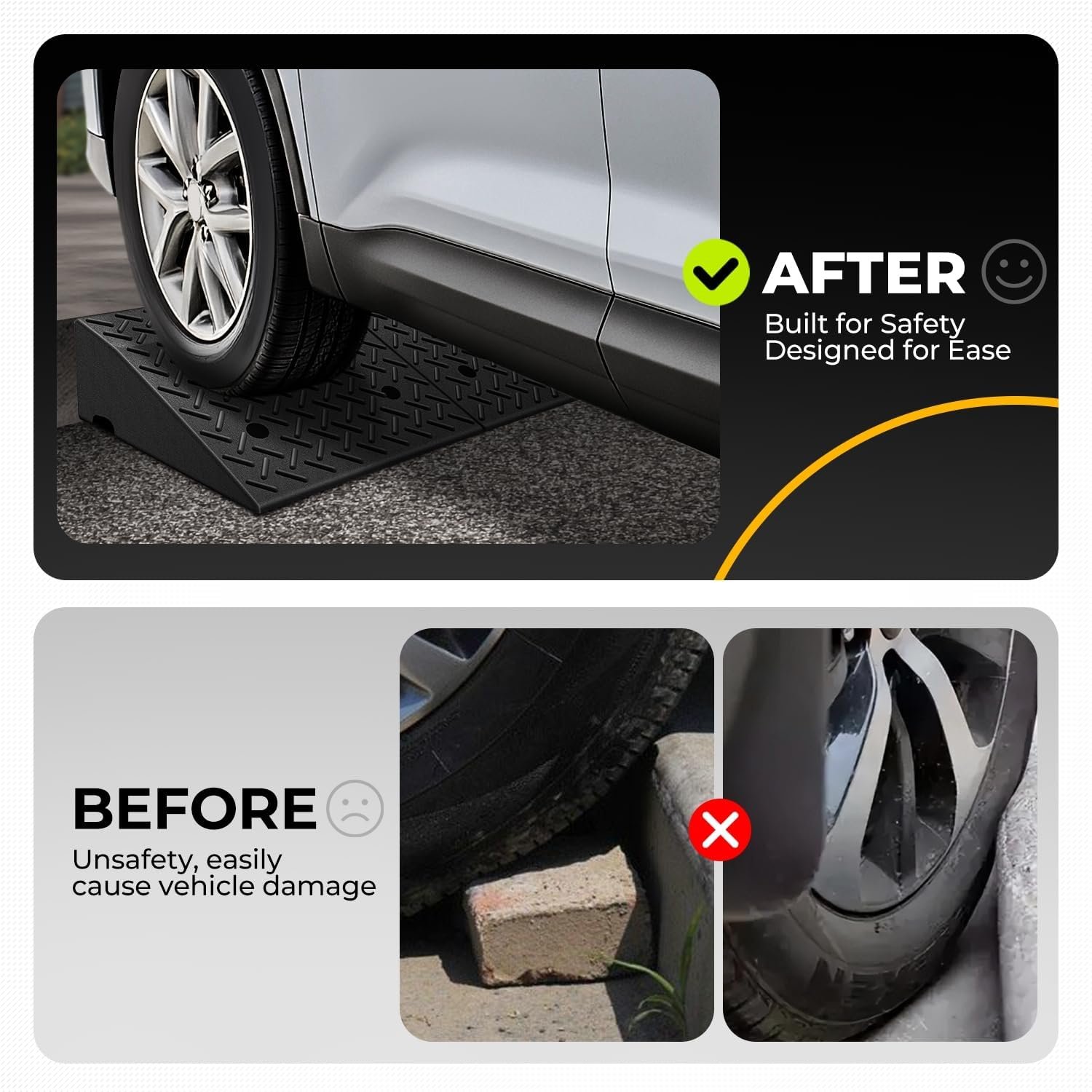 7″ Lift Height Rubber Curb Ramp: Auto Dynasty rubber curb ramp measures 38.5” x 19.6″ x 7”, which is 7 inches lift height and capable of supporting up to 4400lbs/2T, helping your vehicles get over curbs smoothly.