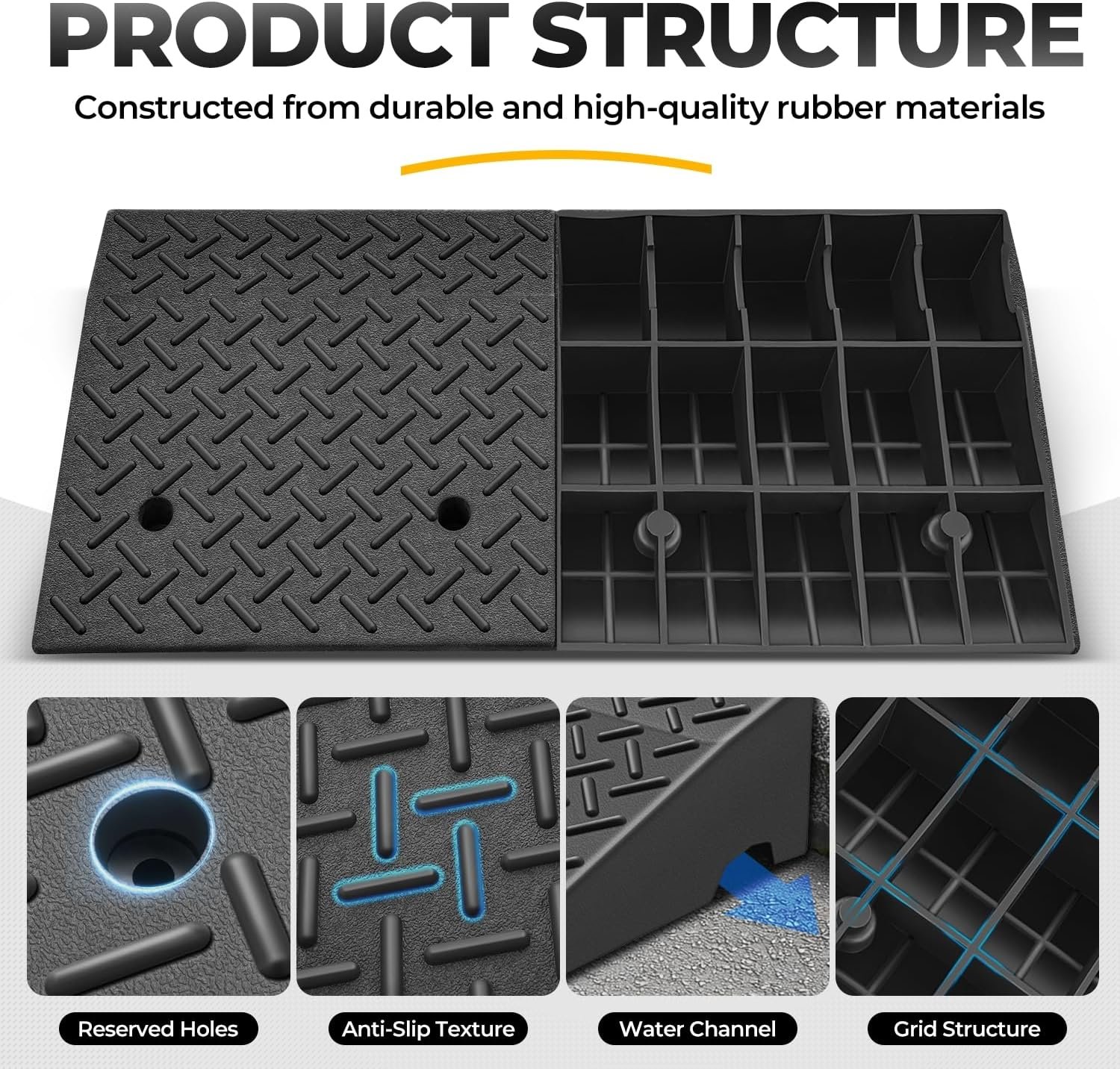 Durable Material: Our curb ramps are constructed from durable and high-quality rubber materials, which feature wear-proof and weather-proof material for long-lasting use against harsh weather conditions. Also, each piece has reserved holes enabling lasting installation.