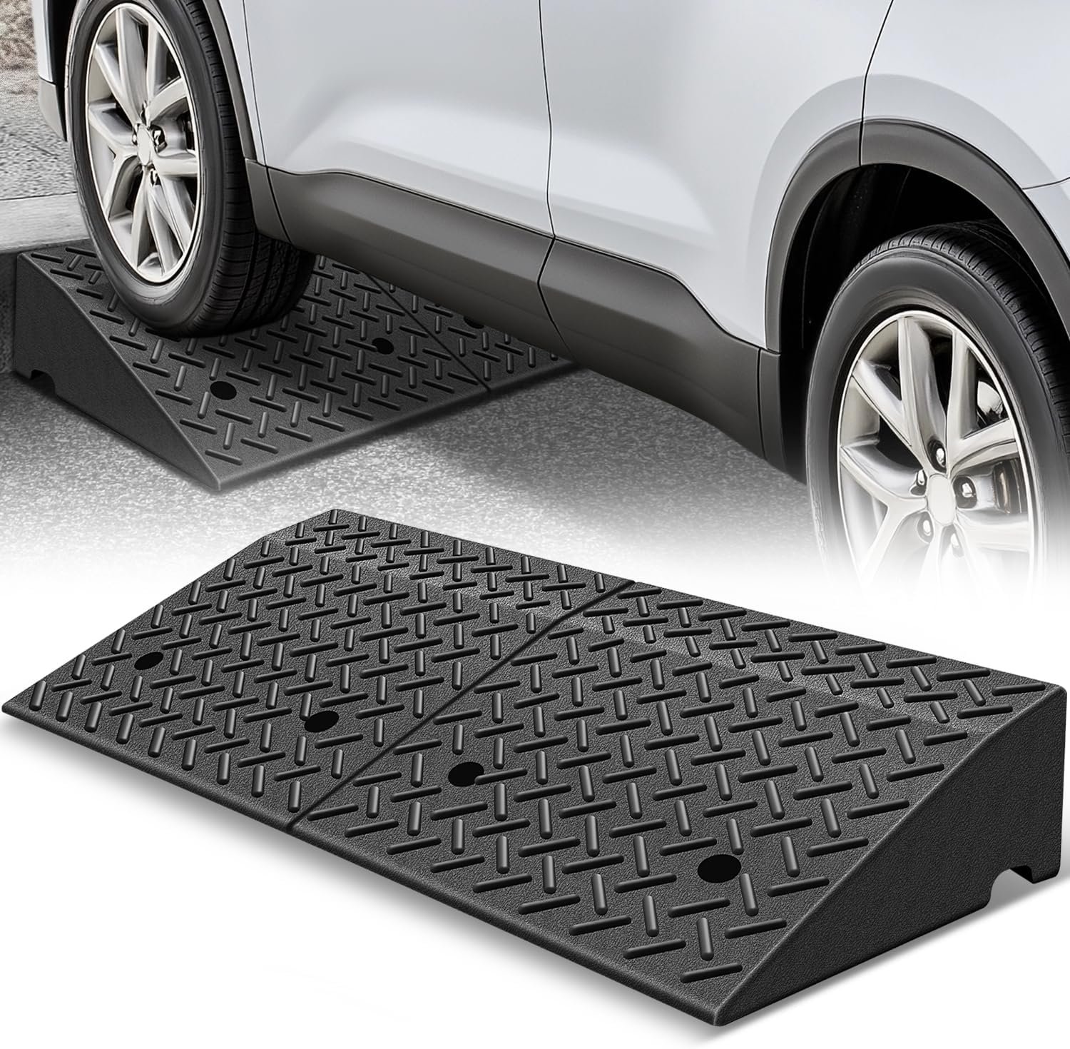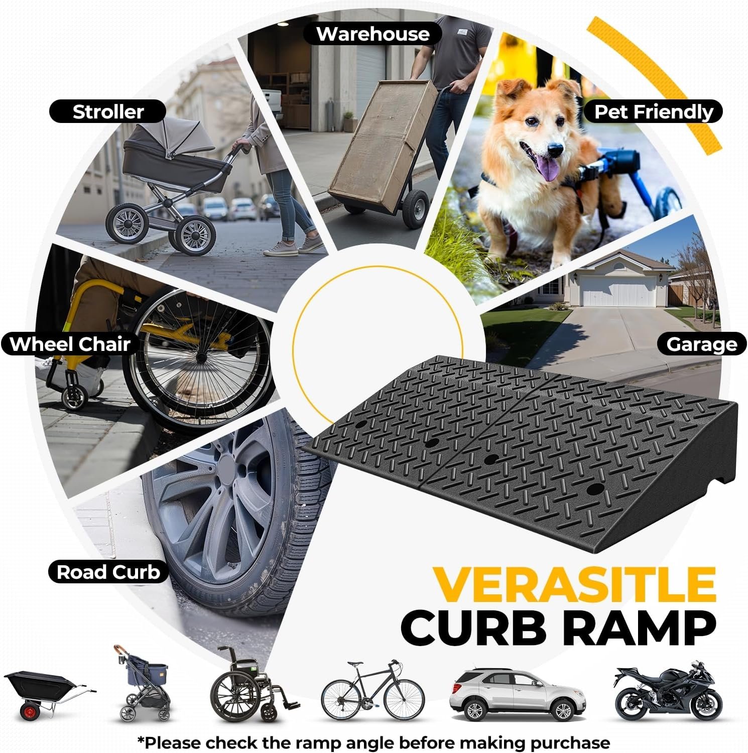 Wide Application: The portable rubber curb ramps have a variety of uses, it is the perfect solution for a wide array of settings, including curbs, driveways, garages, loading docks, parking lots, and more, also can be easily enables your cars, trucks, motorcycles, RVs, bikes, trailers, or other vehicles to transition to an elevated surface with ease.