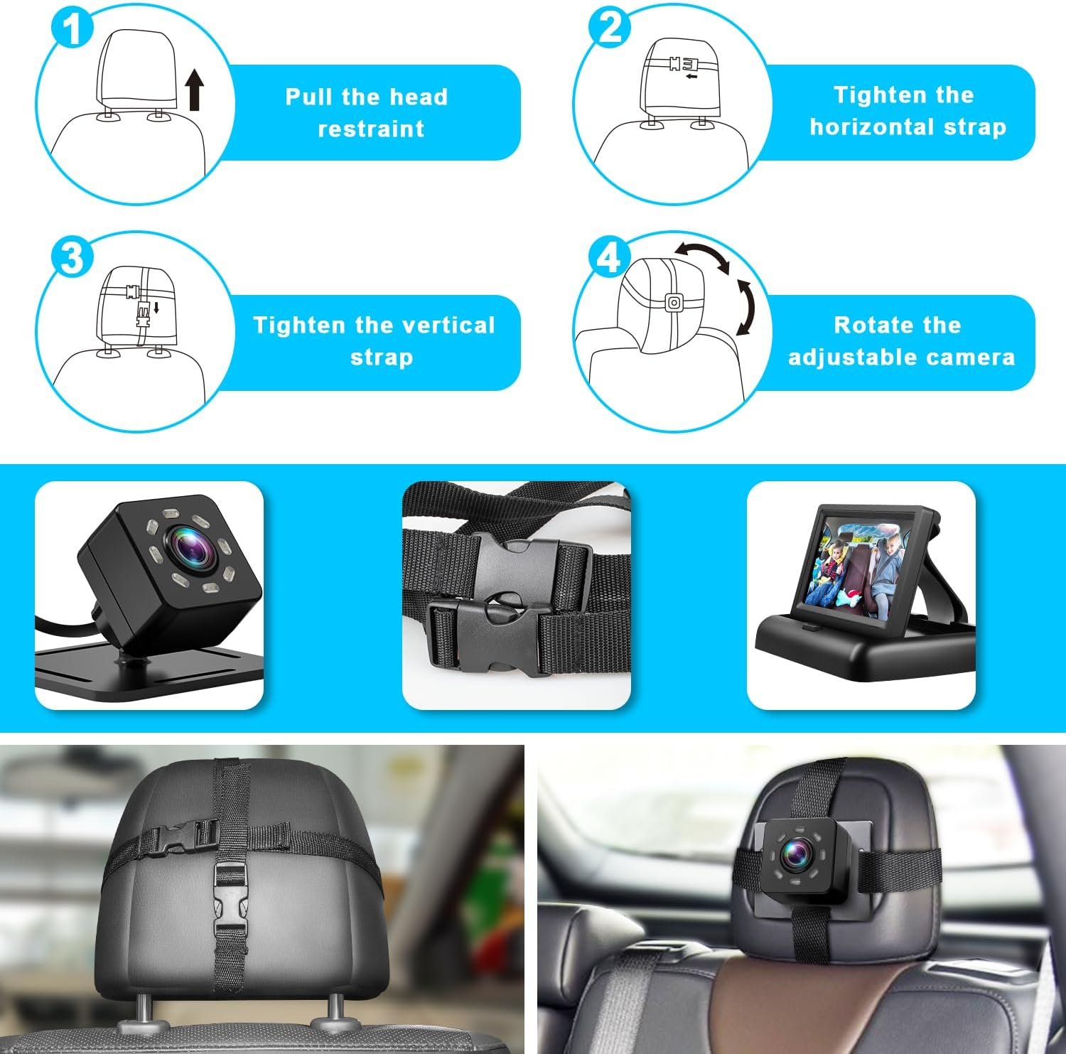 4.360° Adjustable Camera with Full Coverage: after tightening your vertical and horizontal straps to your headrest, the 360° rotating camera can be easily adjusted for the best view angle of crystal clear image according to your car model and the size of the car safety seat, it allows you to keep your lovely baby in sight and look good after him or her all the time.
