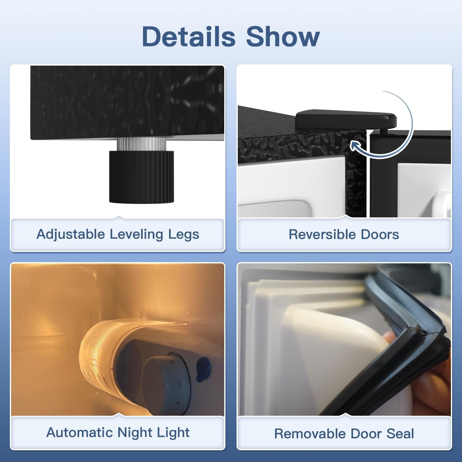 Thoughtful Details: This small refrigerator features reversible doors for your convenience. The automatic LED helps you easily find items in the dark. Bottom leveling legs ensure stable placement on uneven floors. The removable door seal simplifies cleaning. An ice tray and defrost tool are also provided.
