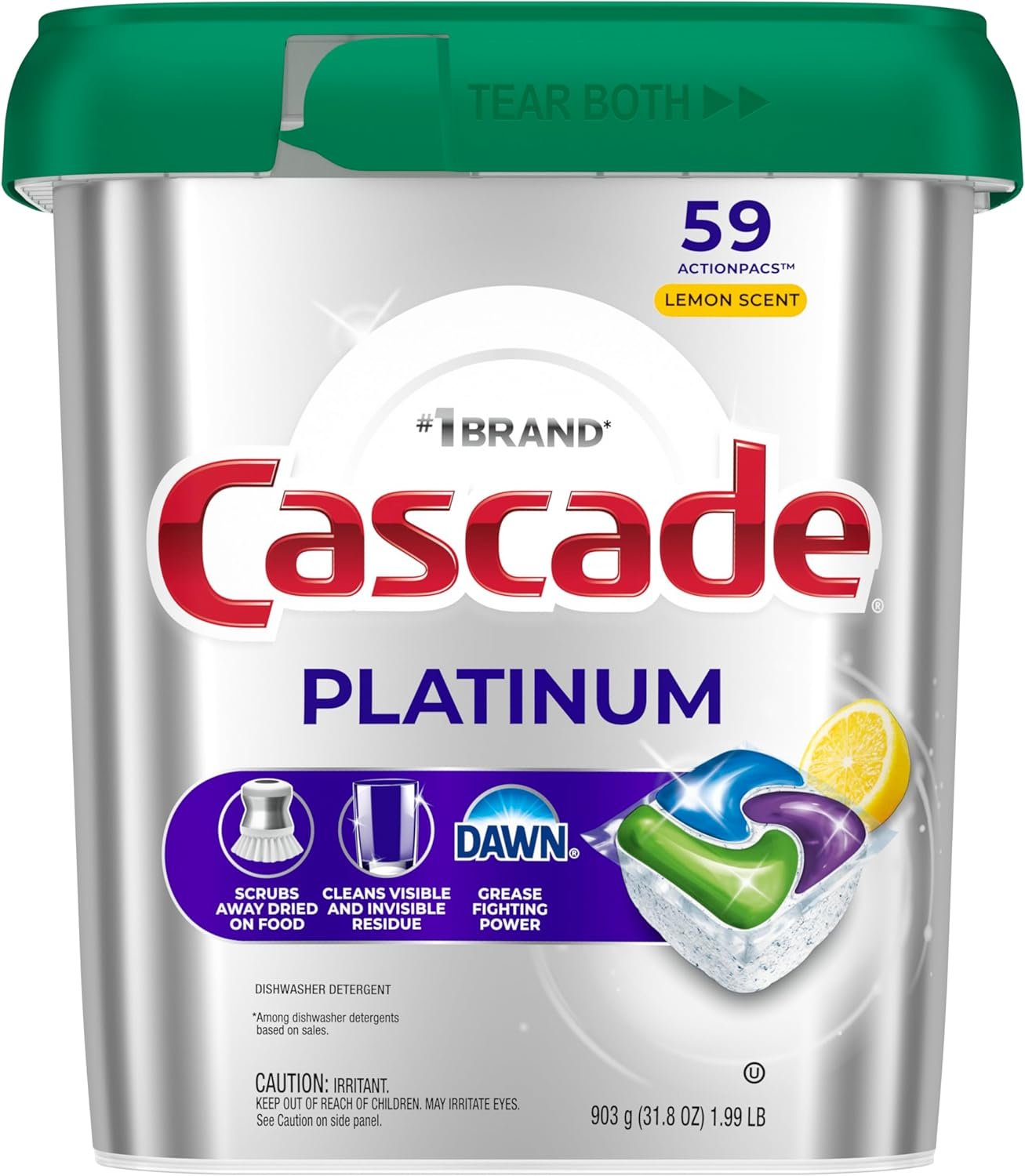 New and Improved Cascade Platinum ActionPacs dishwasher detergent scrubs away dried on food with no pre-washing required. That’s because the pod dissolves fast to start cleaning right away, releasing the soaking power of Dawn dishwashing liquid, while food-seeking enzymes latch on and break down food into particles so small they can flow right down the drain. Cascade Platinum dishwashing detergent is formulated to remove visible and invisible residue for gleaming glassware and dazzling dishes. Save up to 20 gallons of water per dishwasher load when you skip the pre-wash and run your dishwasher with Cascade Platinum