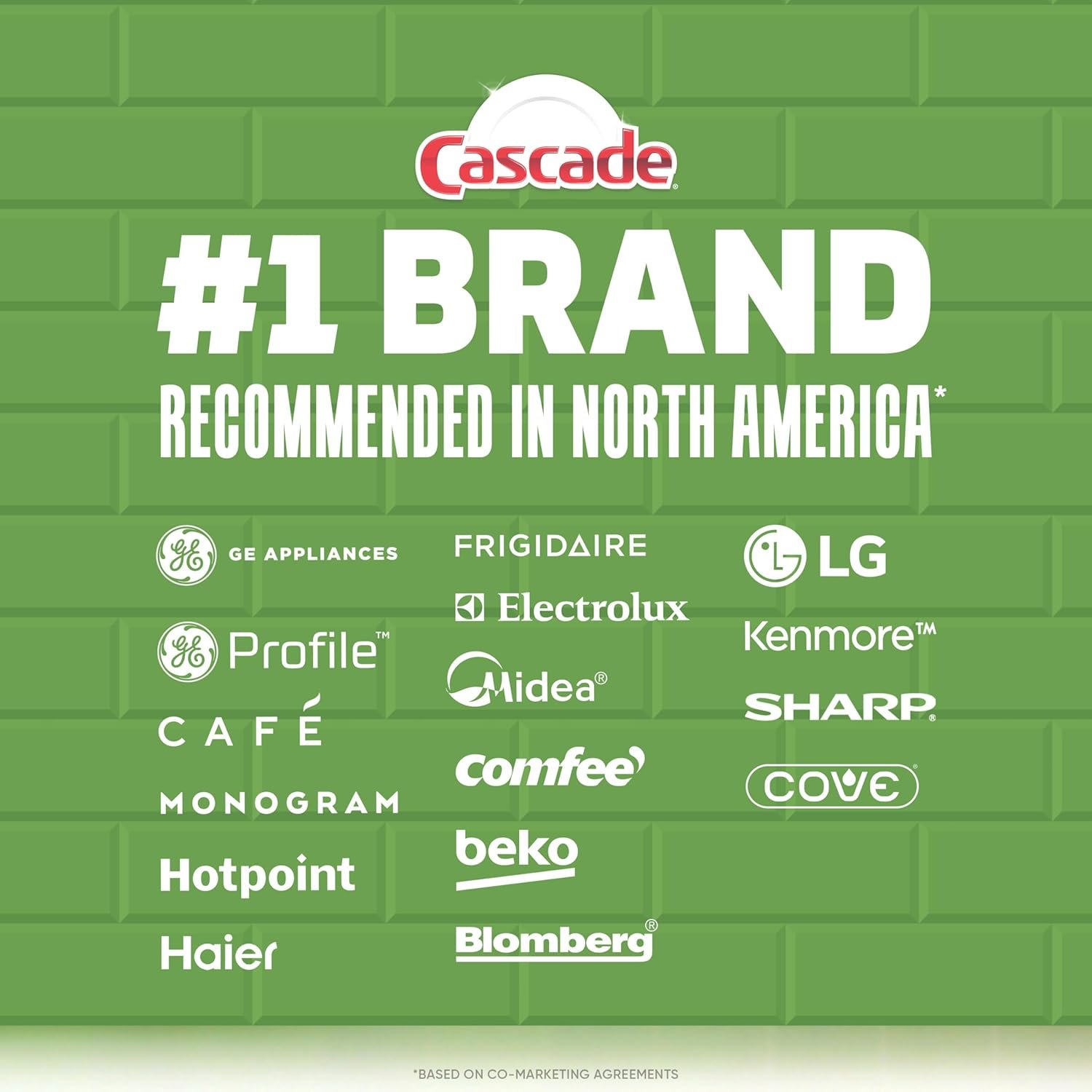 #1 Recommended Brand in North America* *More dishwasher brands in North America recommend Cascade based on co-marketing agreements vs. other automatic dishwasher detergent brands