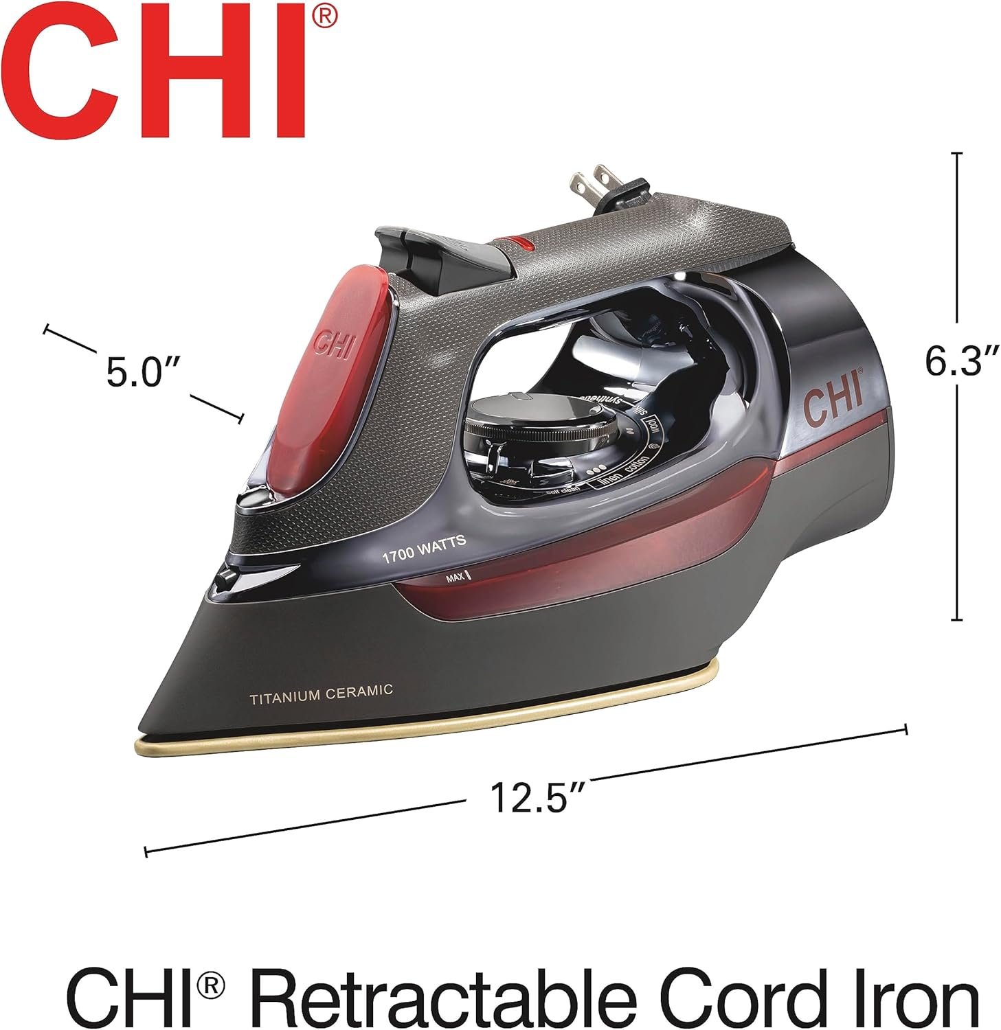 Give your clothes the smooth glide and steaming power of the pros with the CHI® Retractable Cord Iron. Designed for professional ironing performance, it is engineered with CHI’s iconic ceramic and titanium technology. The CHI Iron delivers the exceptional performance you can only expect from CHI. The titanium-infused, ceramic soleplate provides durability and an exceptionally smooth glide, while over 400 steam holes provide powerful steam for effortless ironing. When you’re finished ironing, the 8-foot retractable cord quickly winds into the base with a press of a button for easy storage. The temperature control dial allows for quick fabric selection, and the iron heats up quickly, reducing wait times. For peace of mind, the clothing iron is equipped with a 3-way auto shutoff, automatically powering off within 30 seconds if it falls on its soleplate or side, and in 15 minutes if left on its heel. Made with premium materials, this iron offers long-lasting performance and is backed by a 2-year limited warranty.