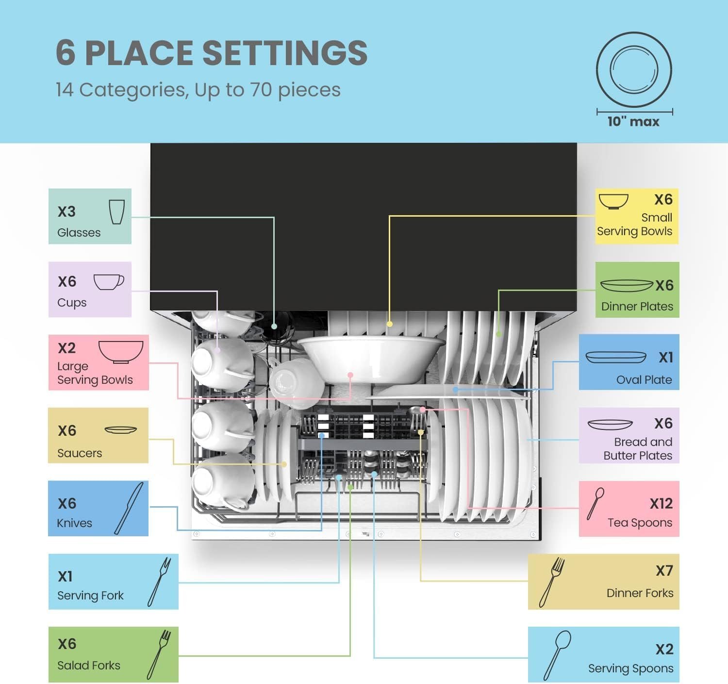 6 Place Setting- A perfect size (H17.2″×W21.6″×D19.7″) for 2-3 people, COMFEE’ compact dishwasher is suitable for dorms, RVs, and apartments. This countertop dishwasher can fit up to 70 pieces of tableware and has a plate size of up to 10 inches in diameter. Note: COMFEE dishwashers are tested at the factory before they are shipped. If your new dishwasher has some water inside, this is normal.
