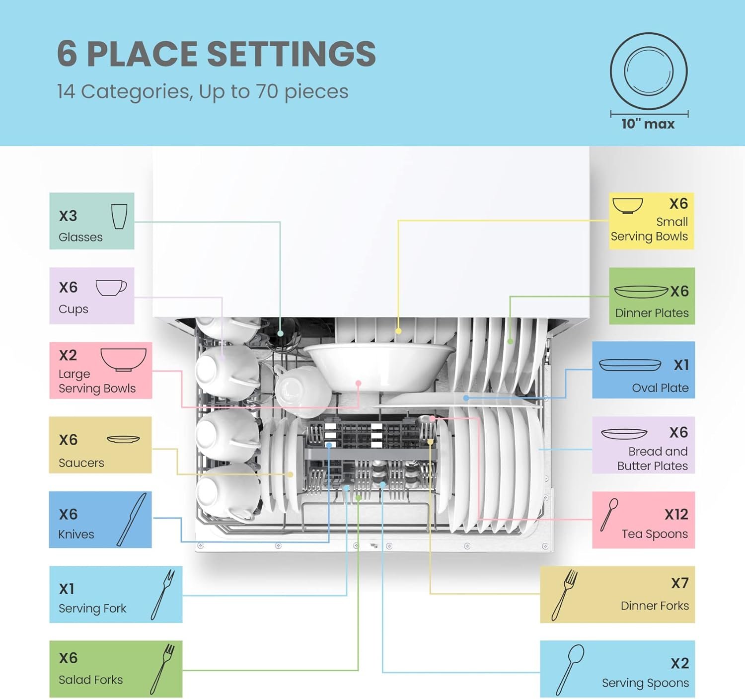 6 Place Setting- A perfect size (H17.2″×W21.6″×D19.7″) for 2-3 people, COMFEE’ compact dishwasher is suitable for dorms, RVs, and apartments. This countertop dishwasher can fit up to 70 pieces of tableware and has a plate size of up to 10 inches in diameter. Note: COMFEE dishwashers are tested at the factory before they are shipped. If your new dishwasher has some water inside, this is normal.