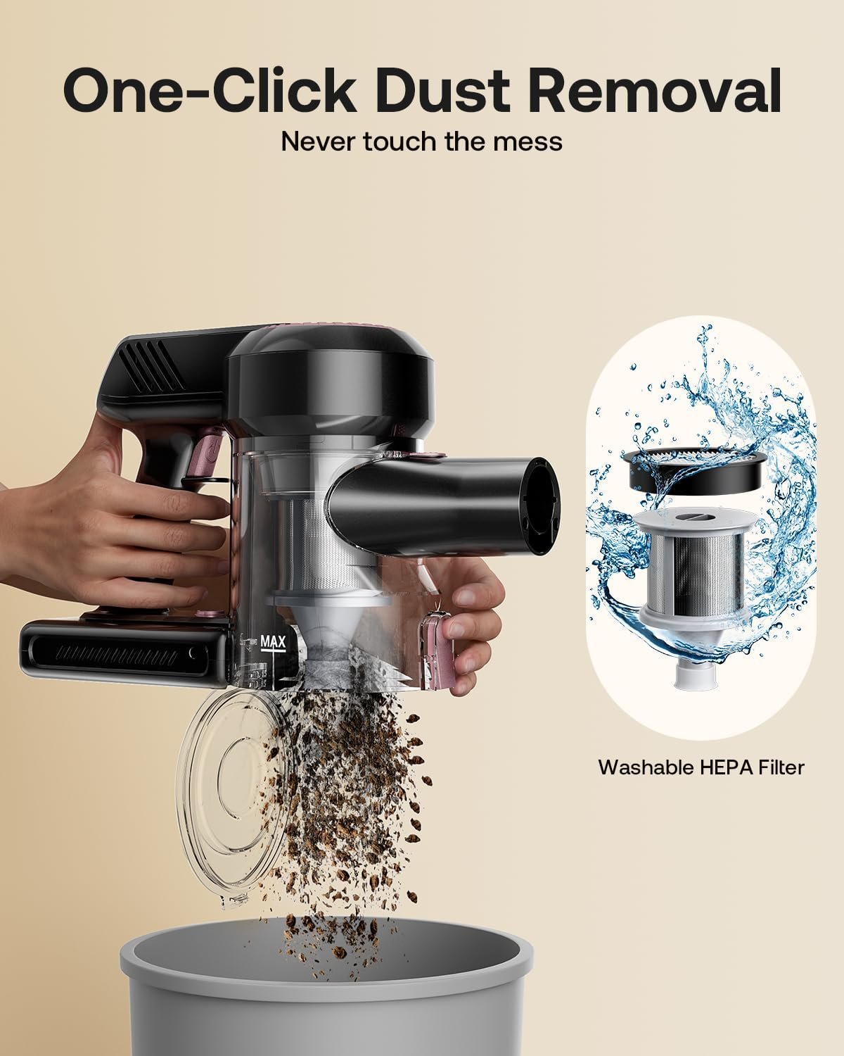 【Better Cleaning Results】6 -layer sealing filtering system makes the vacuum cleaner cordless can capture 99.99 % of fine particles to 0.1um, and provide strong centrifugal force to effectively separate dirt, finally output pure air. Note: Regularly clean the filter to prevent the vacuum cleaner from weakening and blocking