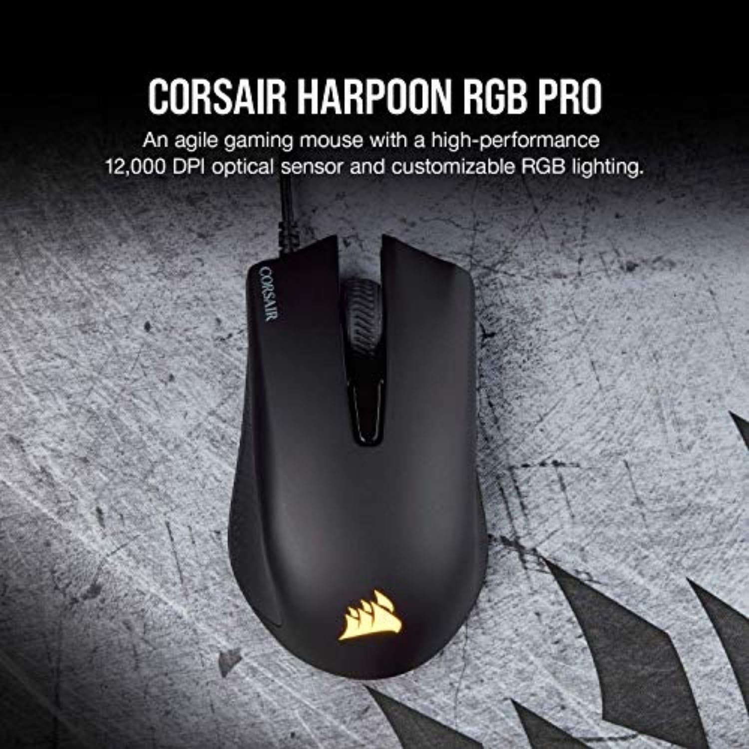 Get ready to win With the Corsair harpoon RGB PRO Gaming mouse Sporting a comfortable contoured shape with rubber side grips and weighing in at an incredibly light 85G for endless hours of effortless gaming Start playing immediately with easy plug-and-play setup Always play your best with six fully programmable buttons for powerful custom macros a precise 12 000 DPI optical sensor and durable high-performance Omron switches Control dynamic RGB Backlighting through Corsair iCUE software and synchronize it with all of your compatible Corsair devices across your entire system Any game any time – The harpoon RGB PRO is quick light and ready to fight.