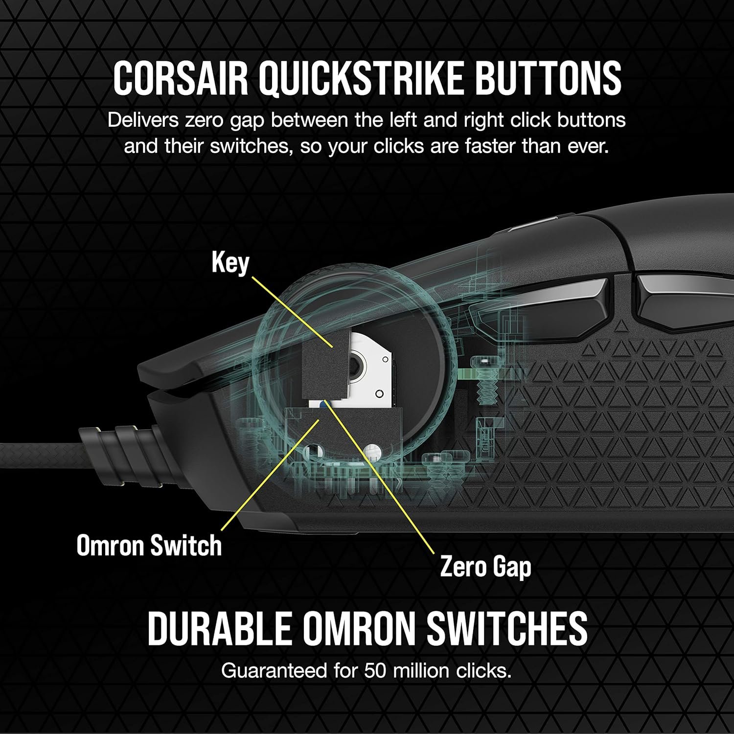 CORSAIR QUICKSTRIKE Buttons: Spring-loaded design delivers zero gap between the left and right click buttons and their switches, so your clicks, shots, and spells are faster than ever