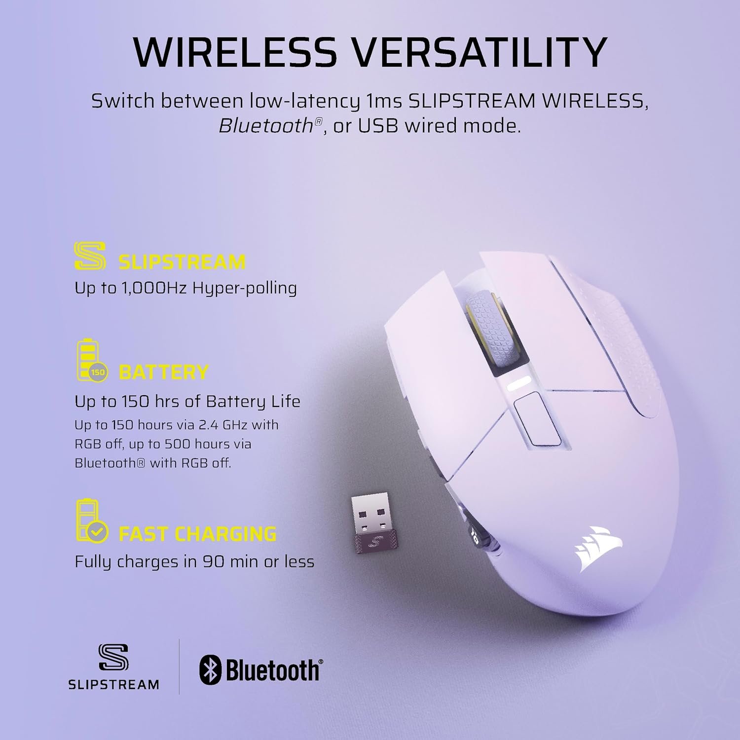 With 16 buttons, an adjustable 12-button Key Slider, the astonishingly accurate MARKSMAN S 33K sensor, and low-latency SLIPSTREAM WIRELESS, the CORSAIR SCIMITAR ELITE WIRELESS SE MMO Gaming Mouse is legendary MMO gaming gear. Embrace wireless freedom and enjoy up to 150 hours* of gaming on a single charge. Control the situation during intense raids and boss fights with 16 customizable buttons and the patented adjustable Key Slider which puts 12 buttons in comfortable reach of your thumb. Also control your stream like never before with native Elgato Stream Deck integration giving you quick access to your most important functions. *Up to 150 hours via 2.4 GHz with RGB off, up to 500 hours via Bluetooth® with RGB off. Technical Specifications: Wired Connectivity: USB 2.0 Type-A Wireless Connectivity: 2.4 GHz via USB 2.0 Type-A Wireless Receiver Bluetooth 4.2 +LE Battery Type: Built-in Lithium-Polymer, Rechargeable Battery Life: 2.4 GHz – Up to 150 hours, Bluetooth – Up to 150 hours via 2.4 GHz with RGB off, Up to 500 hours via Bluetooth® with RGB off. Sensor: CORSAIR MARKSMAN S Sensor Type: Optical DPI Resolution: 100~33,000, with 1 DPI with steps Max IPS: 750 Onboard Profile: 3 Backlight: 3-Zone RGB Buttons: 16 USB Polling Rate: 2.4Ghz Wireless – 125Hz, 250Hz, 500Hz, 1000Hz (Default), USB Wired – 125Hz, 250Hz, 500Hz, 1000Hz (Default) Colour: White Mouse Feet: PTFE Cable Length: 1.8m / 6ft. Cable Material: Braided iCUE Software: Supported in CUE Dimensions: 119.23(L) x 73.48(W) x 42.17(H) mm / 4.69”(L) x 2.89”(W) x 1.66”(H) Weight (w/o cable and accessories): 114 g / 0.25 lbs