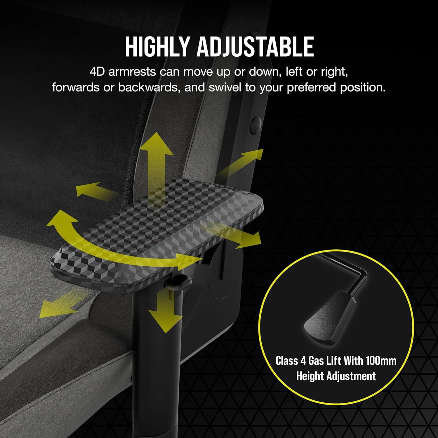 4D Armrests: Adjust the armrests in any direction – up or down, left or right, forward or backward, or swiveled to support your posture.