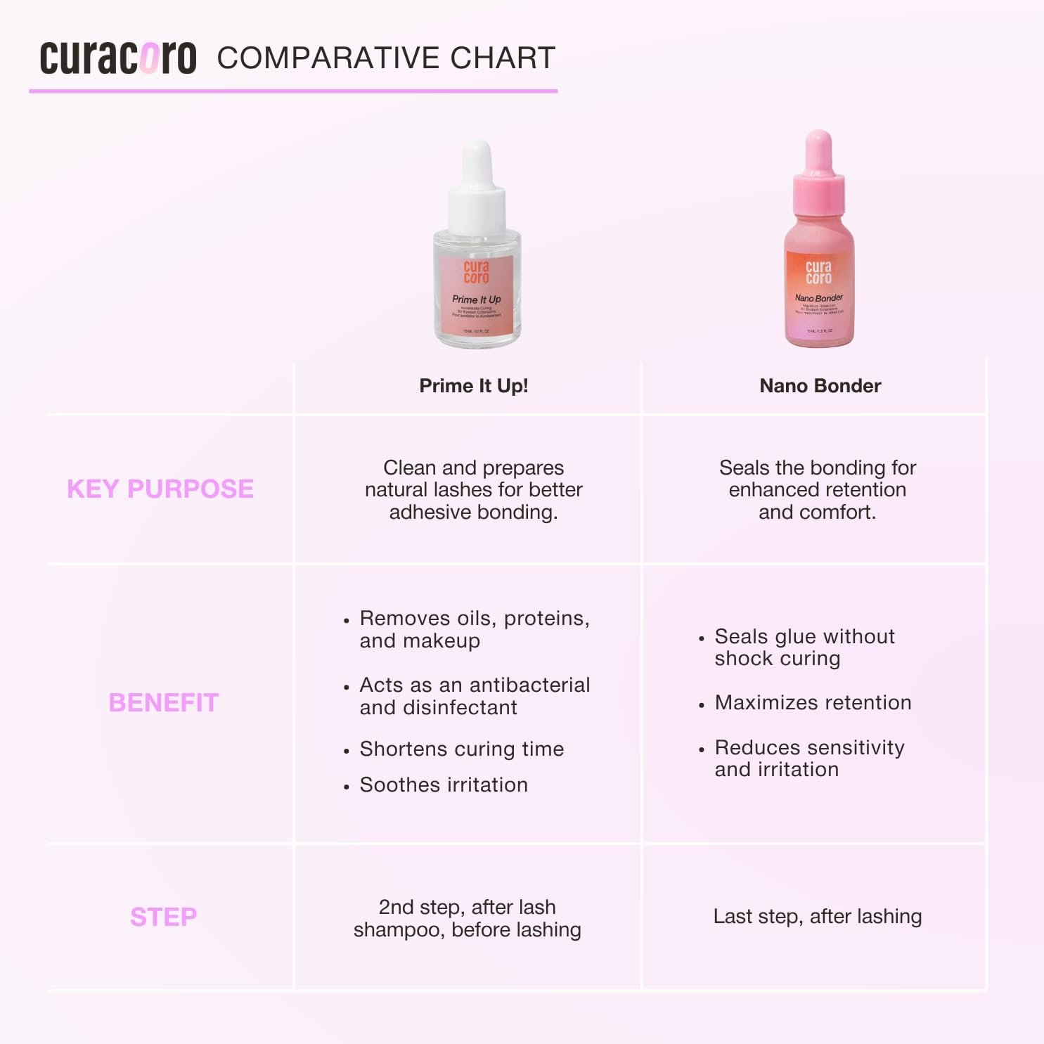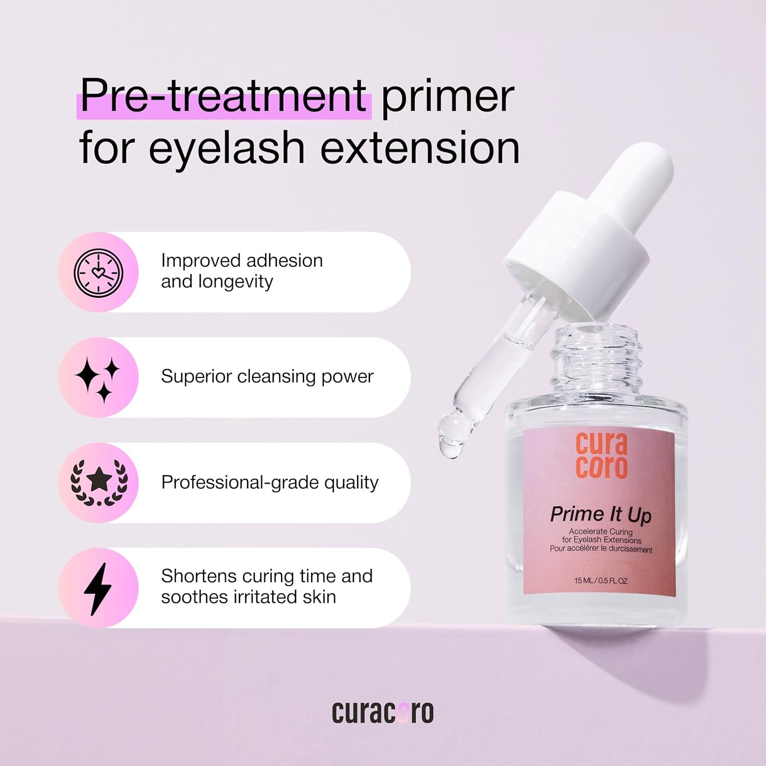 Deep Clean & pH Balanced: Effectively removes oils, proteins, and makeup residue after your lash bath – essential for optimal lash prep. Curacoro Prime It Up helps balance pH levels and boosts adhesive performance for better hold and durability.