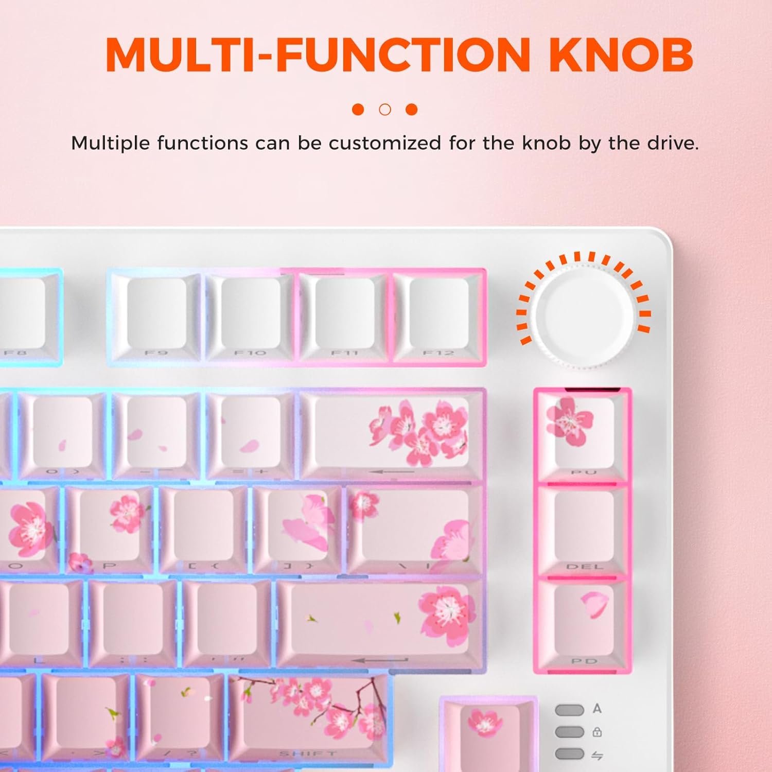 81 KEYS LAYOUT&KNOB CONTROL – 75% keyboard makes the desktop more concise. Multiple FN key combos provide shortcut commands. The pink keyboard is equipped with a multi-function knob. Pre-set in the driver, you can quickly adjust volume, playback, brightness, or call up common tools such as calculator, mail, player, etc, for more convenience and practicality.