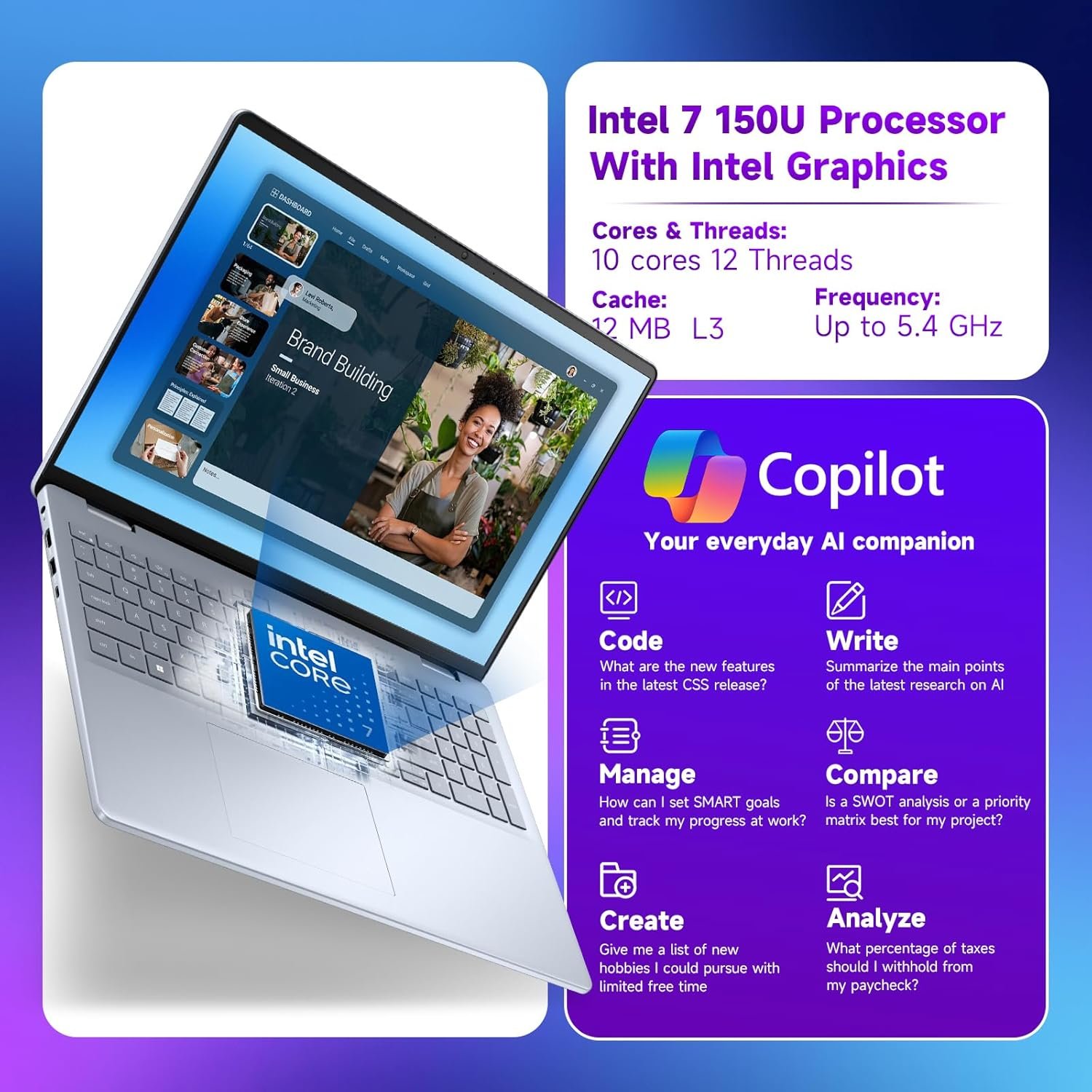 ✔ Powered by the Intel Core i7-150U processor, featuring 10 cores and a turbo frequency of up to 5.4 GHz, delivering robust performance for multitasking and productivity.