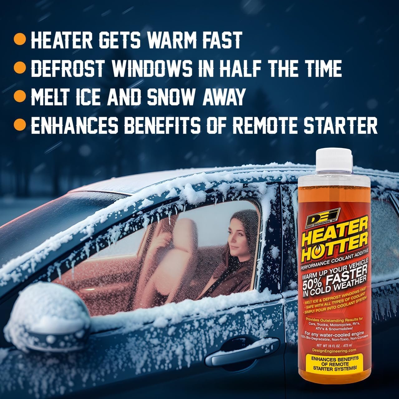 DEI Heater Hotter is formulated specifically to accelerate the transfer of heat from engine to cooling system in frigid climates that otherwise increase engine wear. Heater Hotter’s unique formula allows your vehicle’s heater to warm up 50% faster in even sub-zero temperatures and is safe to mix with all types of anti-freeze. Just simply add to your radiator.