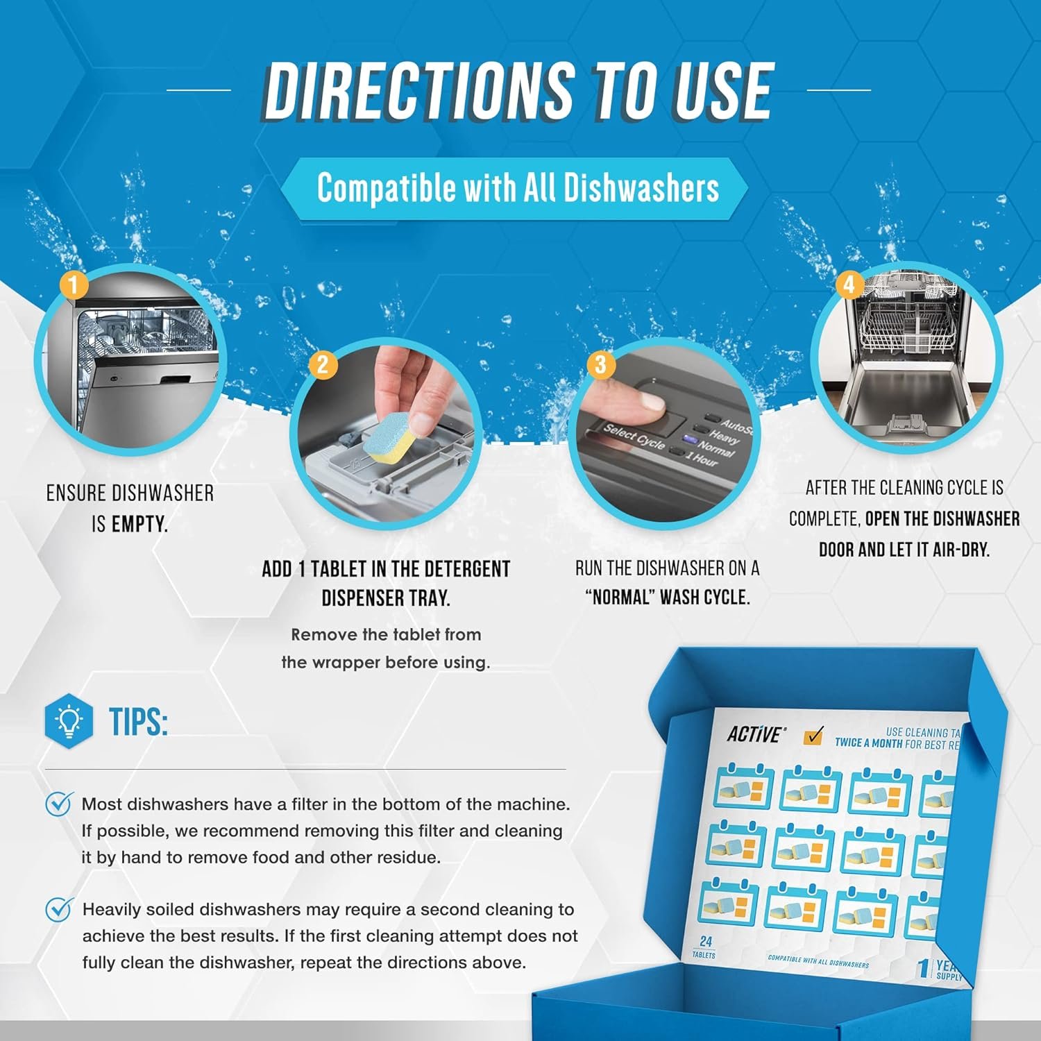 Monthly Maintenance Solution – Keep your dishmachine cleaned with ACTIVE kitchen cleaning supplies. Use single or 2 treatment tabs per month. Place pod inside empty disheasher, run a self clean or regular dishwash to restore your machine. If extra cleaning is needed, always perform two separate cleaning cycles with a single tablet each, adding more cleaner can result in excess foam that effects function.