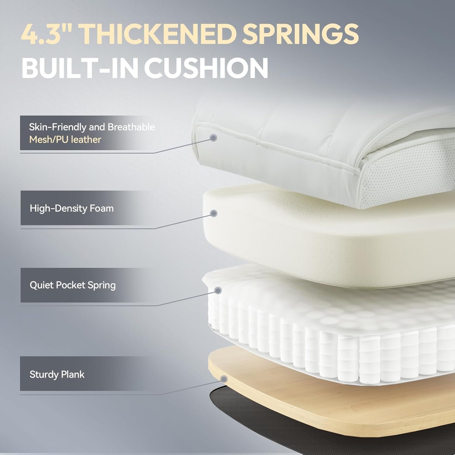 Individual Pocket Springs:The seat cushion is composed of pocket springs, a type of spring commonly used in sofas. Each spring operates independently, offering elasticity and support by adapting to pressure and contouring to your body’s weight, providing a luxurious and comfortable experience akin to that of a sofa