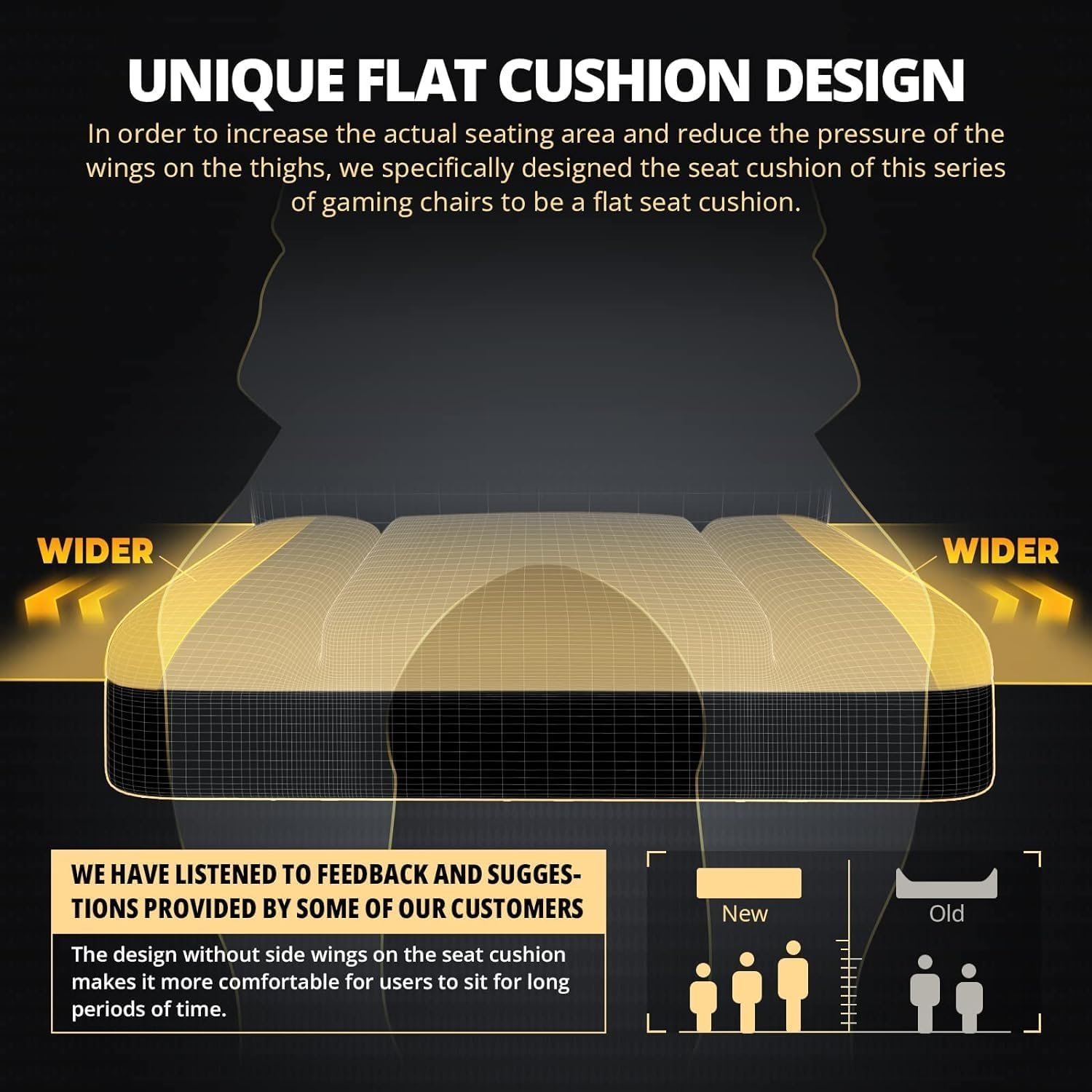 We have listened to many customers and removed the side wings of the seat and added spring pocket on the interior of the seat to give a significant increase in comfort.