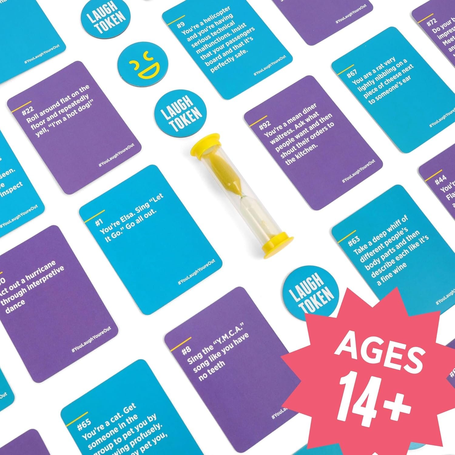 Includes 125 prompt cards, 36 laugh tokens, and 1 sand timer