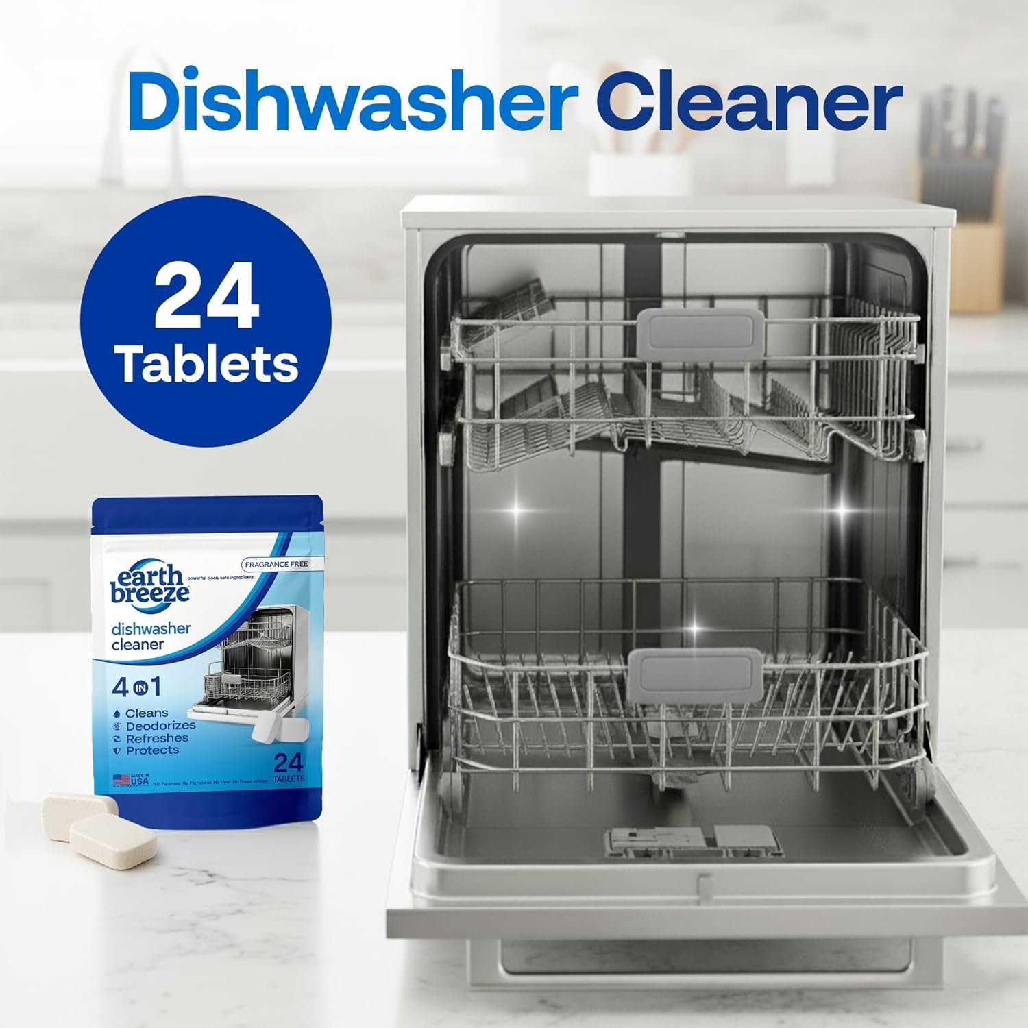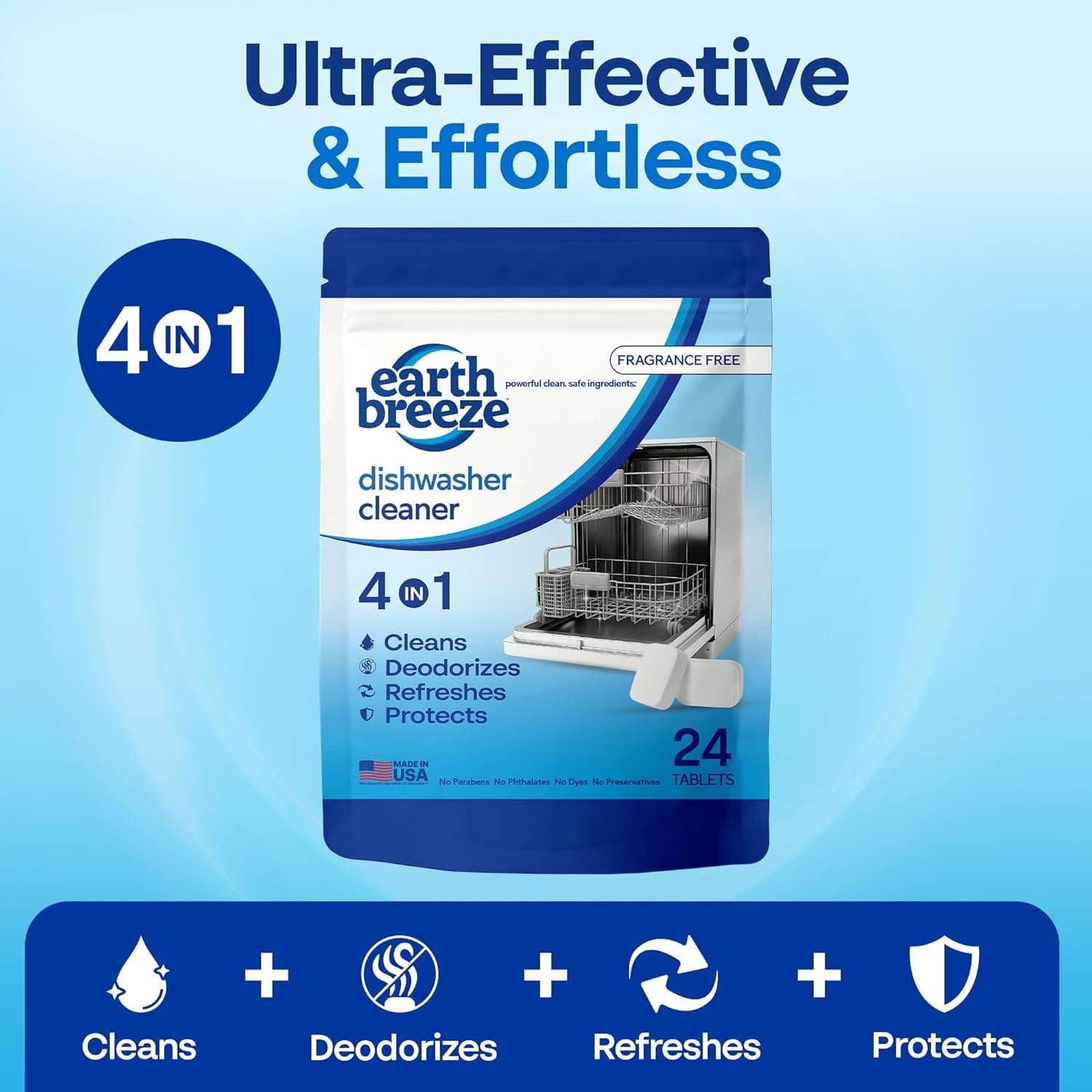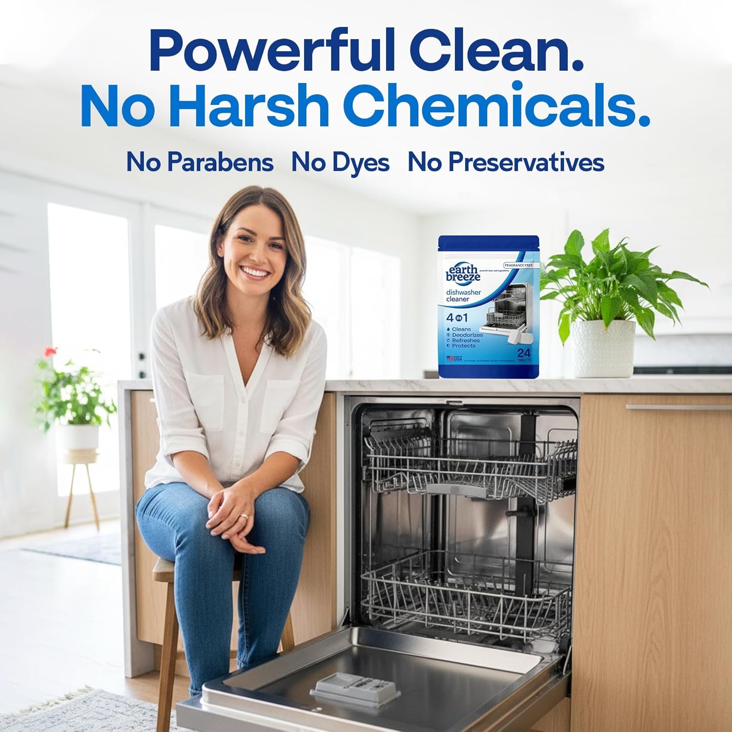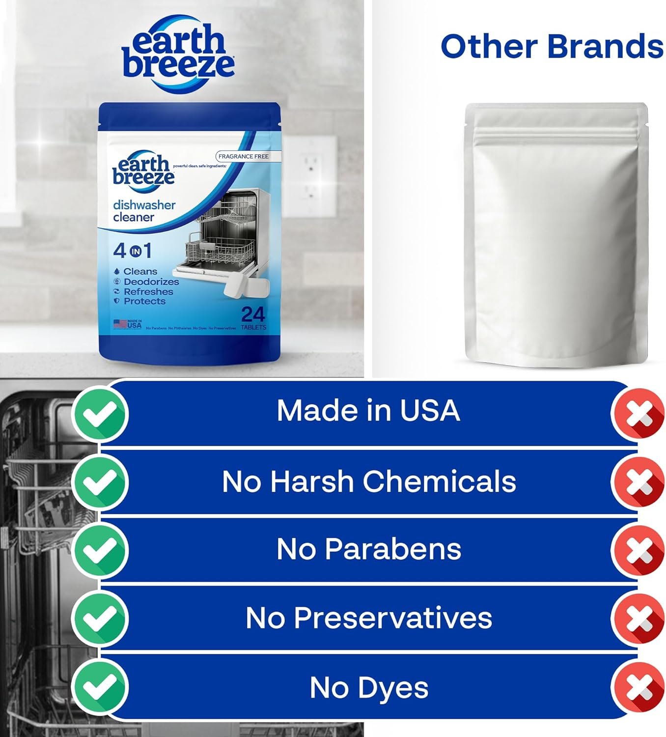 4-in-1 Deep Cleaning Power Made in the USA – Earth Breeze Dishwasher Cleaner Tablets are a fragrance-free solution made in the USA with domestic and imported ingredients. They clean, deodorize, refresh, and protect your machine. Designed to remove buildup, grease, and residue, these tablets keep your dishwasher performing at its best and extend its lifespan.