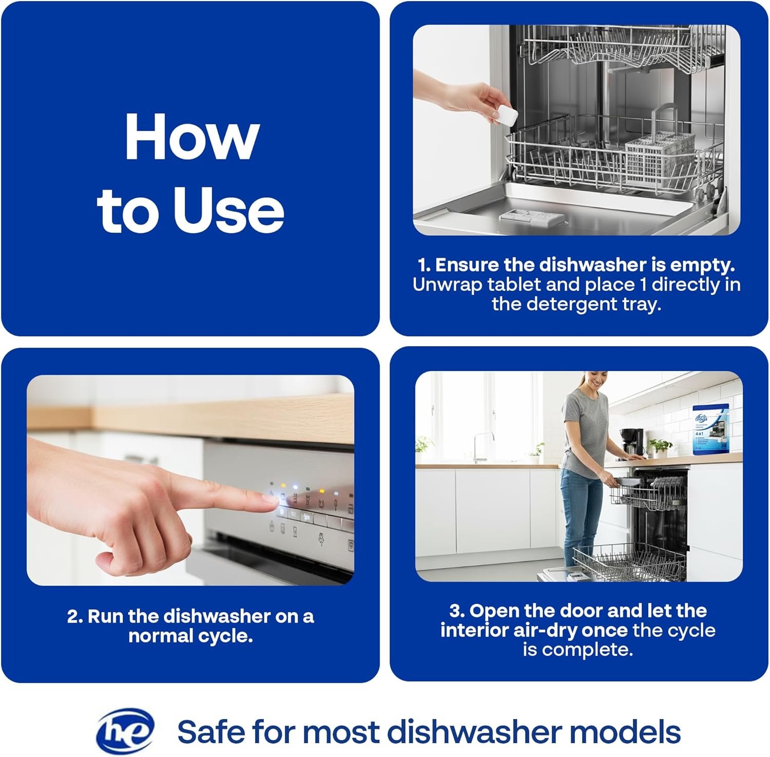 Effortless Maintenance for Every Home – Perfect for homeowners, renters, families, and conscious consumers, this 4-in-1 cleaner makes monthly dishwasher maintenance simple and effective. Just drop a tablet in the detergent tray or bottom rack and run an empty cycle—no scrubbing, no hassle, just lasting freshness.