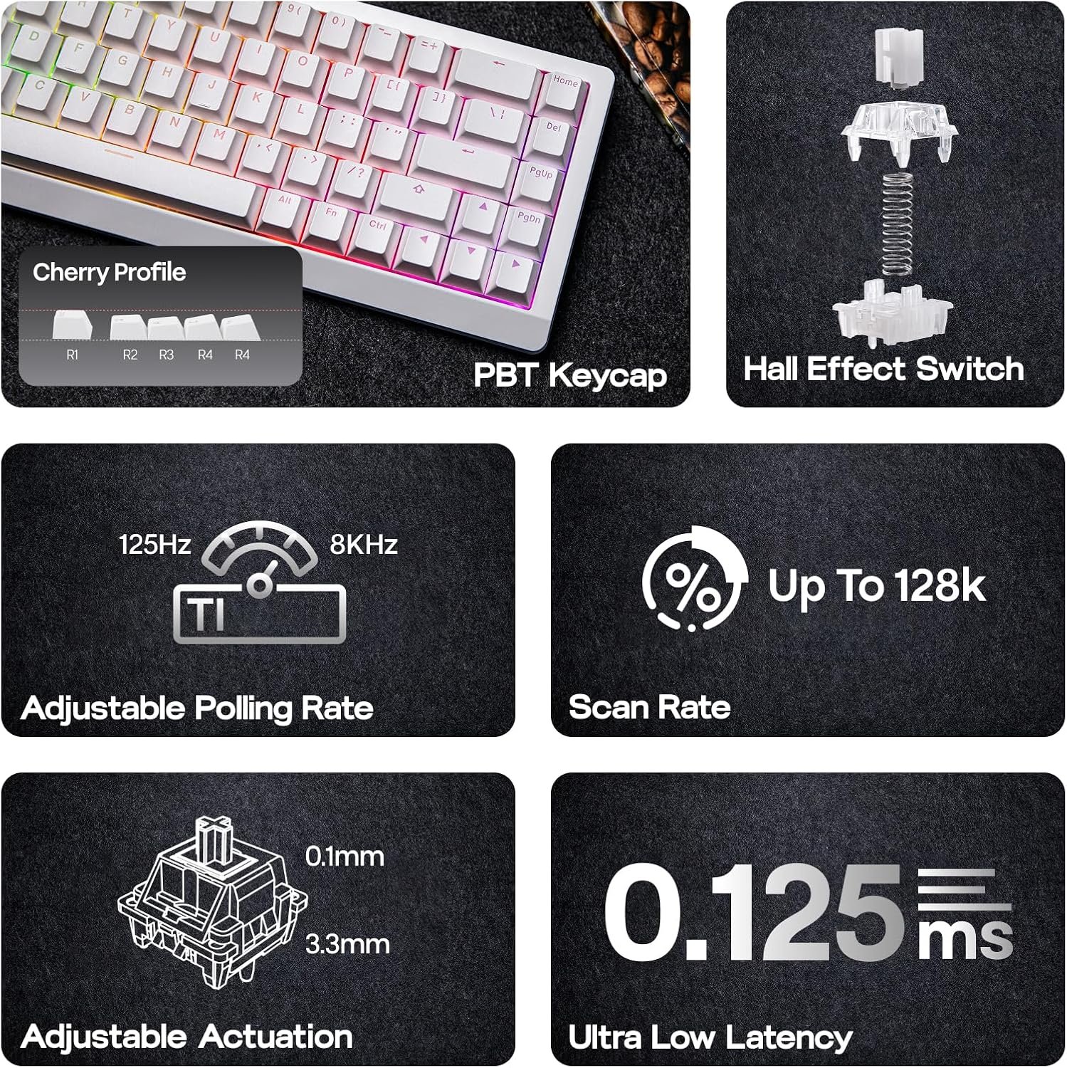 Packed with an Advanced adjustable 8K Polling Rate Chip and Hall effect magnetic switches that eliminate physical contact within the switch, the HE68 Lite wired gaming keyboard delivers an impressive speed of 0.125 milliseconds, 10 times faster than a traditional mechanical keyboard. HE68 Lite upgrades to Cushioned tray-Mount with Poron Foam and foam for exceptional comfort and thocky sound.