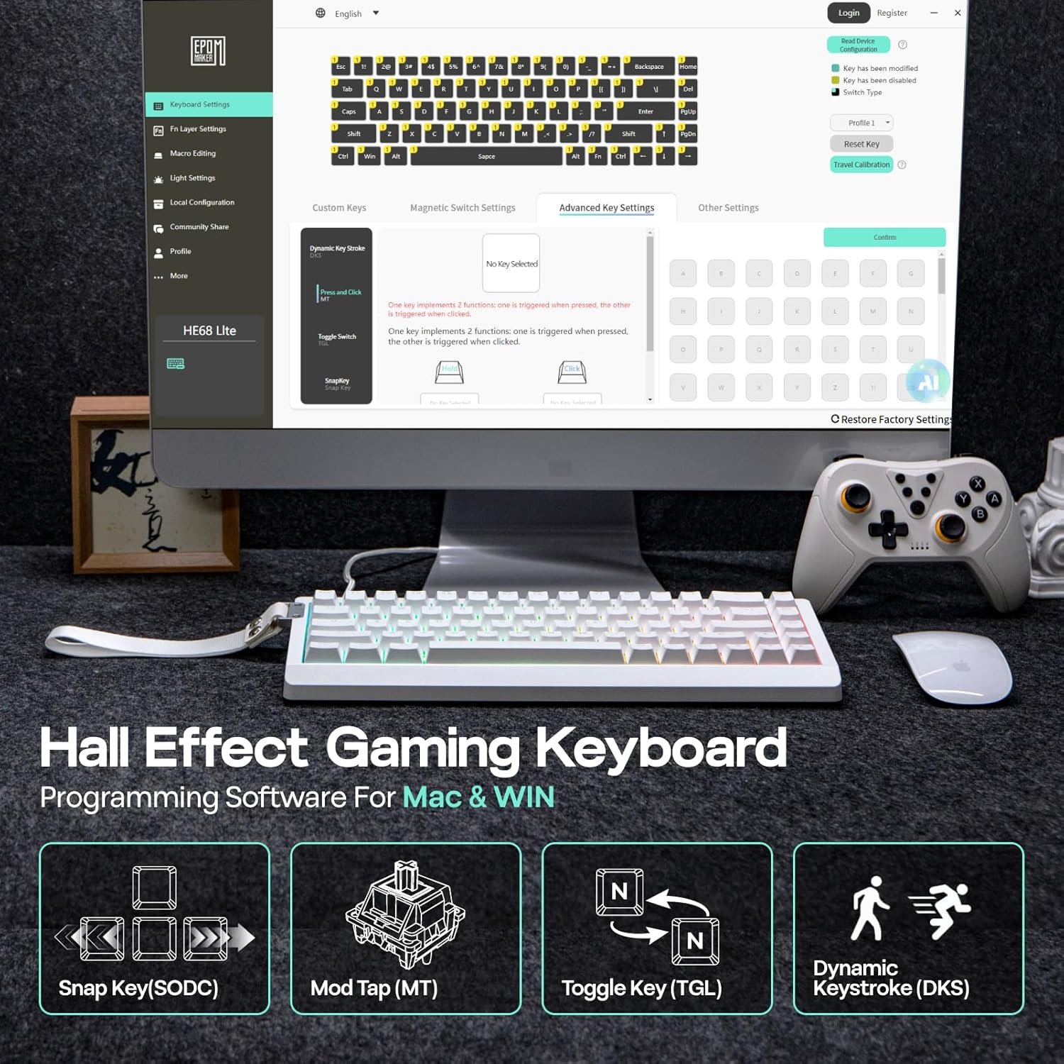 Dynamic Keystroke (DKS) & MT (Mod Tap): Rejoice in the astonishing accuracy and speed of HE68 Lite, for formidable actions in FPS, MOBA, Rhythm, and leisure games. Each keystroke is buttery smooth and consistent, with factory-lubed magnetic linear switch, with swift delivery of action from fingertip to screen; while DKS and MT function enables true analog input, as one stroke delivers up to 4 actions for common actions and key combos.