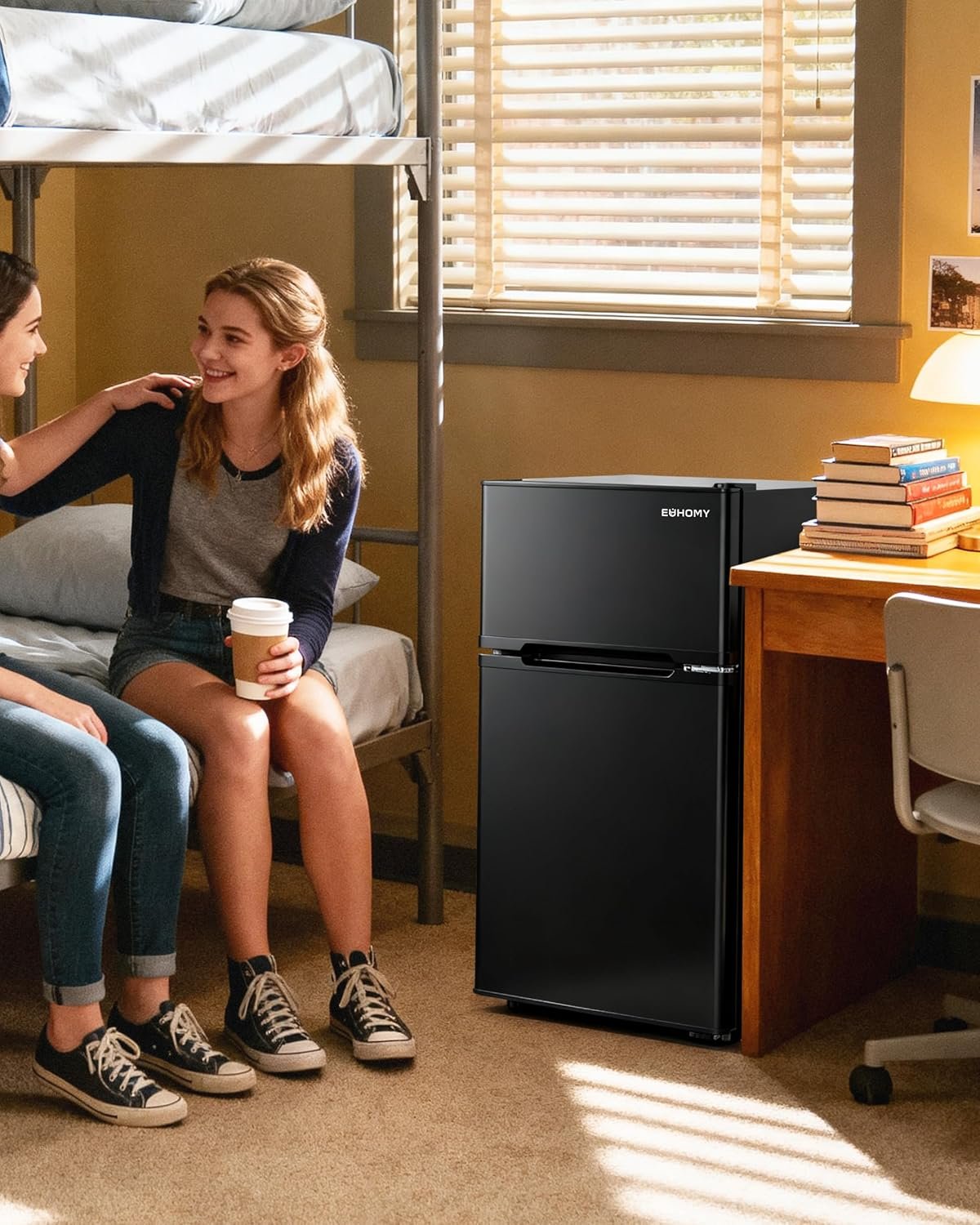 THE PERFECT COMBINATION OF FRIDGE-FREEZER – Euhomy mini fridge with freezer combines the advantages of fridge and freezer to design the dorm fridge with freezer 2 door. Mini frdige has two storage zone at the same time. 0.96 Cu.Ft of freezer zone can be used to store ice cream or frozen food. 2.24 Cu.Ft of fridge zone can be used to preserve fresh fruits, vegetables or refrigerated drinks. When you buy a Small fridge it is equivalent to buying a fridge and a freezer at the same time