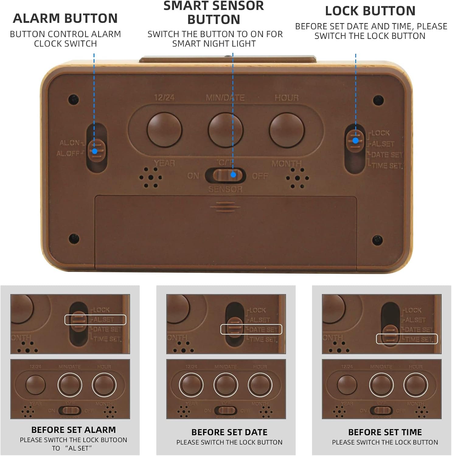 SMART LIGHT SENSOR: This digital clock has a switch to turn on the back light, so we can read time in dark or in the middle of the night to know the time. And it is absolutely not too bright to bother when sleeping