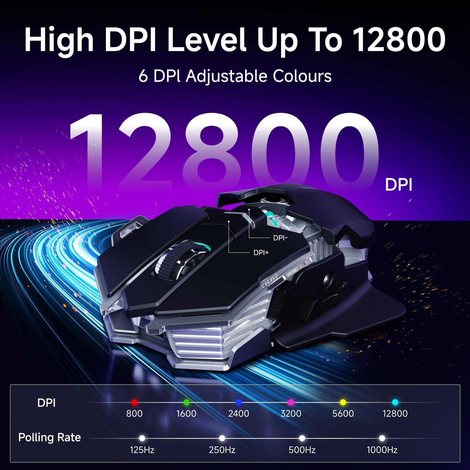 【12800 DPI & RGB Backlit Indicators】Adjust sensitivity on the fly with up to 12800 DPI for pixel-perfect precision on your optical mouse. This vibrant RGB mouse does more than look cool—it visually indicates your current DPI level with 6 customizable effects, allowing you to personalize your setup to match your unique play style