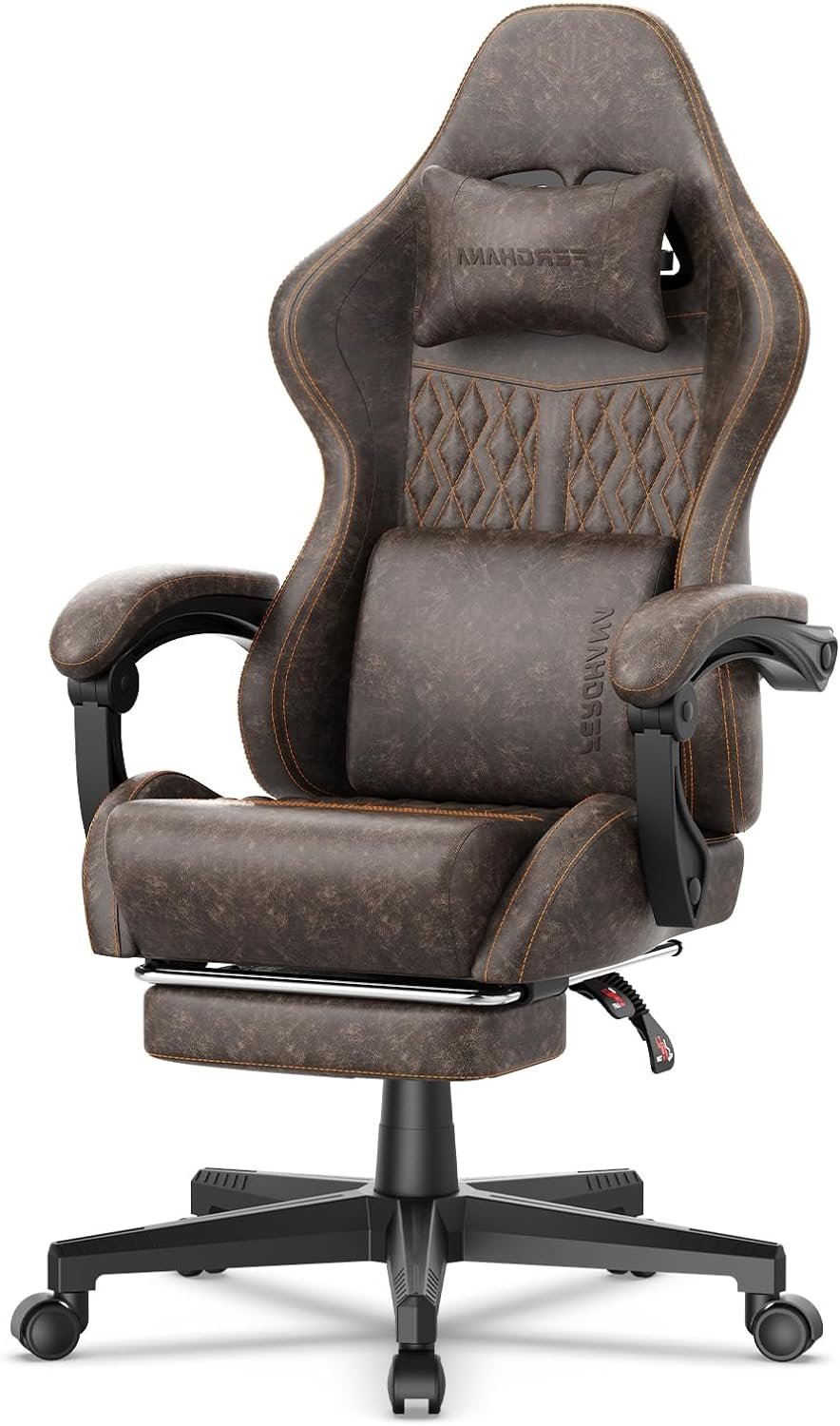 Ferghana Vintage PU Leather Gaming Chair, Ergonomic Gamer Chair with Massage, High Back Computer Office Chair with Footrest for Adults, Racing Style Reclining Video Game Chair (Brown)