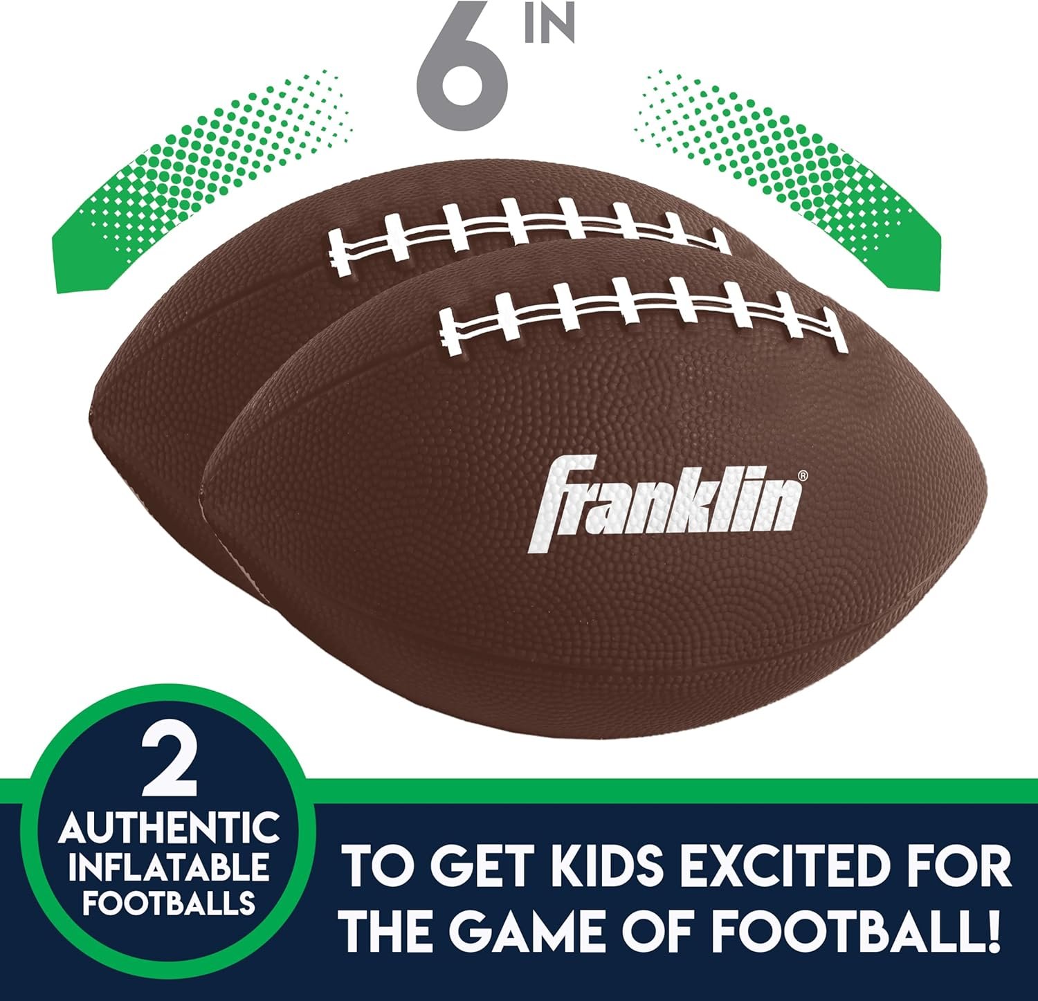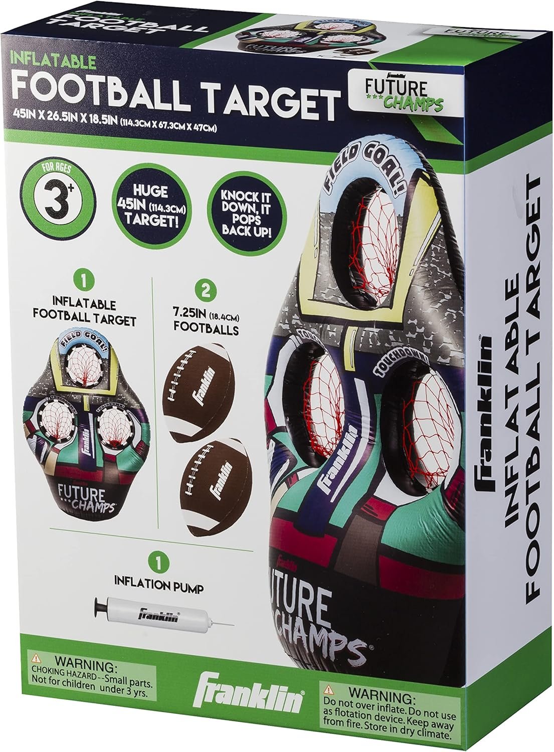 SET INCLUDES: (1) 45” inflatable 3-hole football target with water-fillable base, (2) 7.25” rotationally molded PVC footballs, (1) sports ball hand air pump with needle