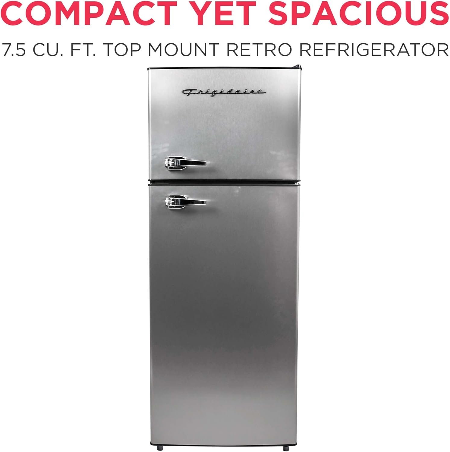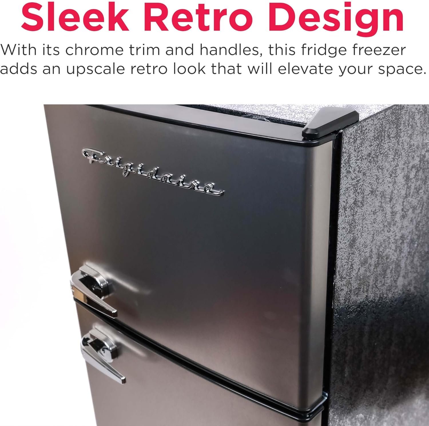SLEEK DESIGN: Featuring a sleek and durable platinum design with chrome trim and handles, this small fridge freezer adds an upscale retro look that will elevate your space.